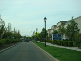 West Avenue runs north as a two-lane divided road through a townhouse development.