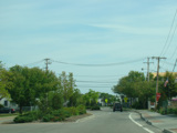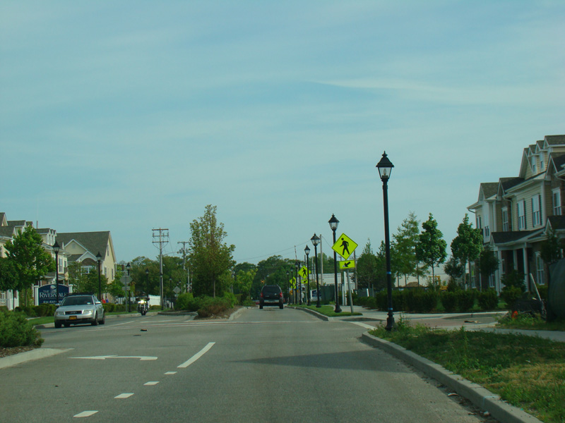 West Avenue runs south as a two-lane divided road through a townhouse development in Patchogue.