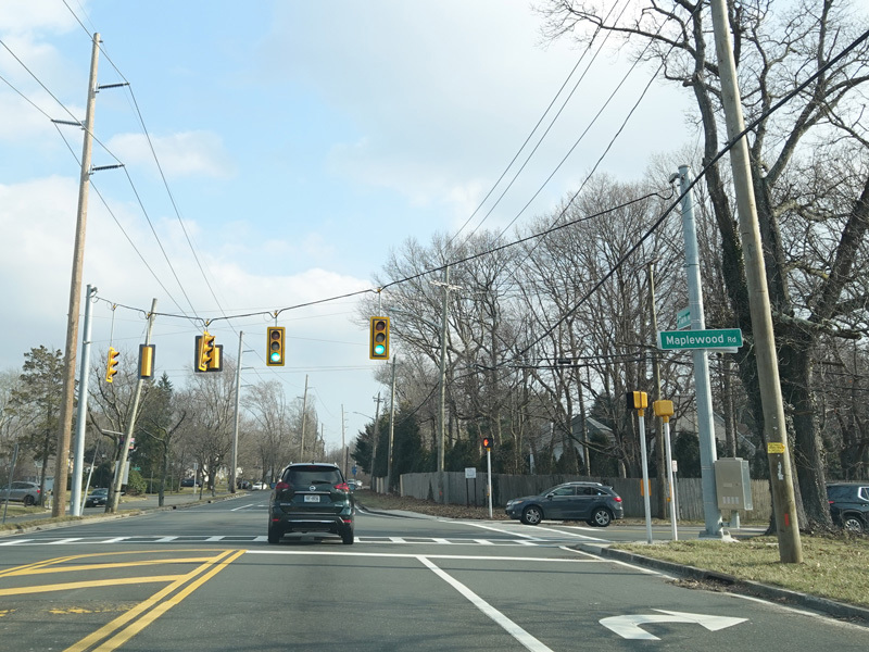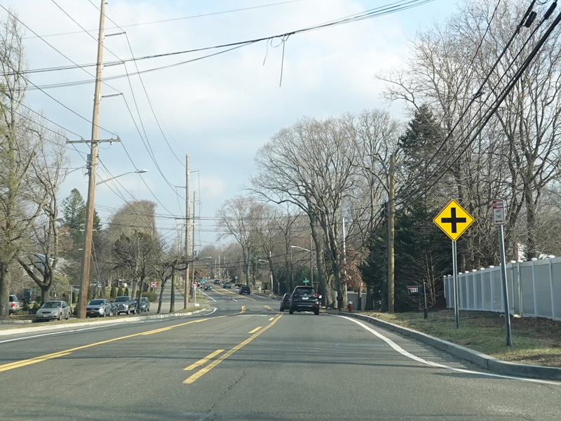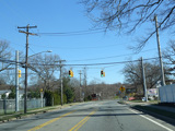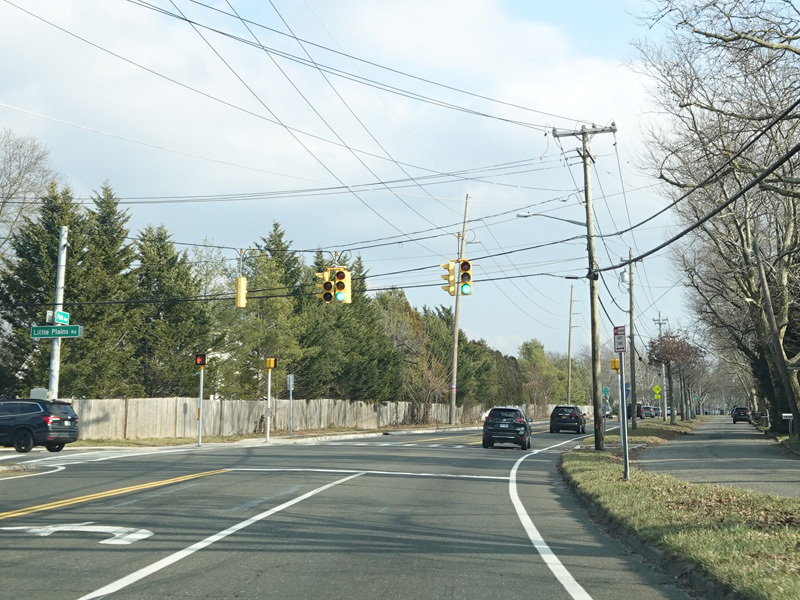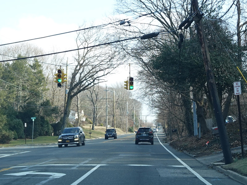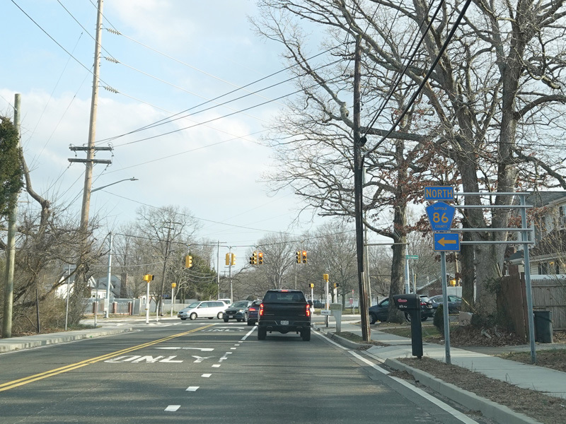 There is a traffic light at Broadway (CR 86). Turn left to go north. This is currently the southern terminus of CR 86, but it extends south to Jericho Turnpike (NY 25) until 2022. The signage assembly originally a sign for the southbound direction as well.