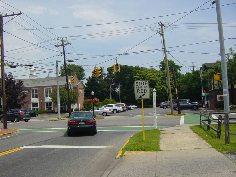This picture shows the traffic light at the end of Park Avenue. The "Stop Here on Red" sign has been removed, and new street signs have been installed.