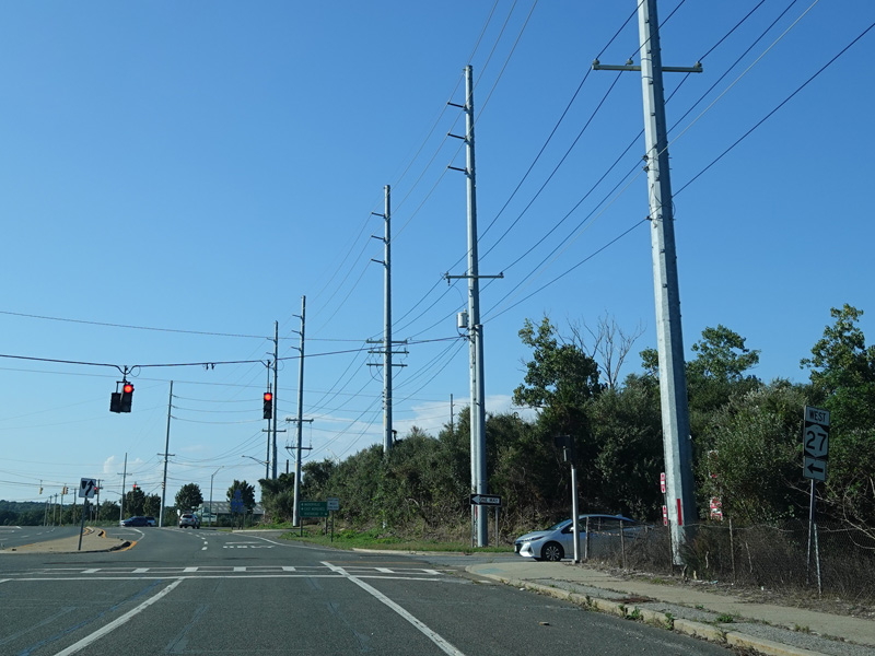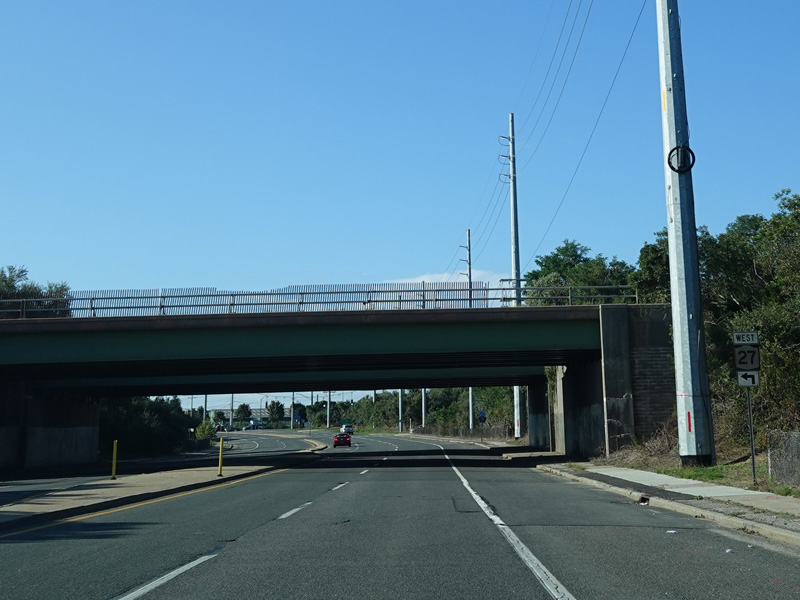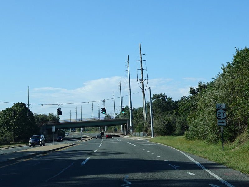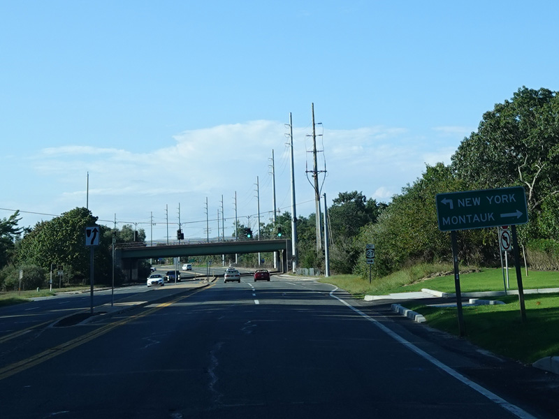 Eastport Manor Road widens to become a four-lane divided road. There is a pair of traffic lights at the service roads of Sunrise Highway (NY 27).
