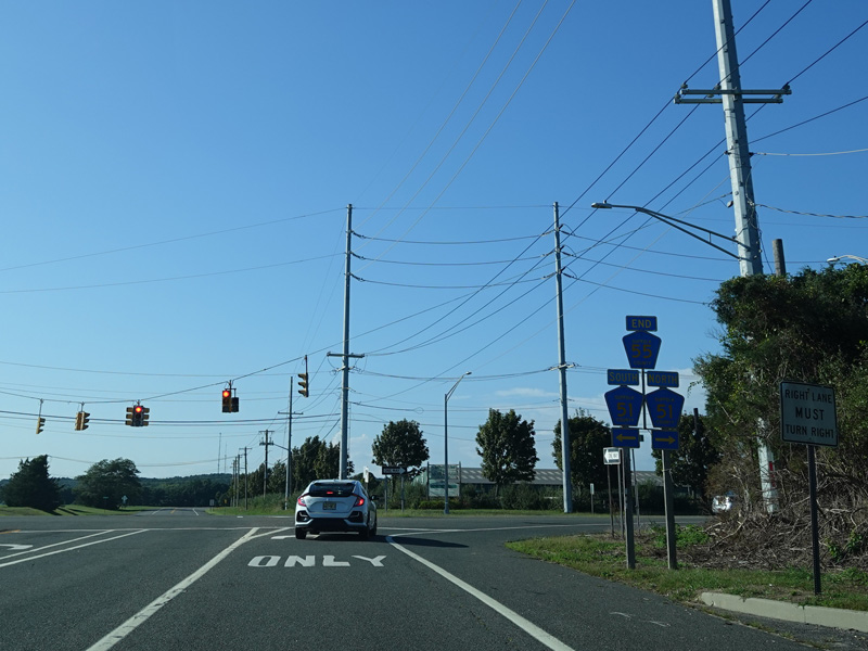 There is a traffic light at East Moriches-Riverhead Road (CR 51). Turn right to go north or left to go south. CR 55 ends here. Eastport Manor Road continues straight ahead as a town road.