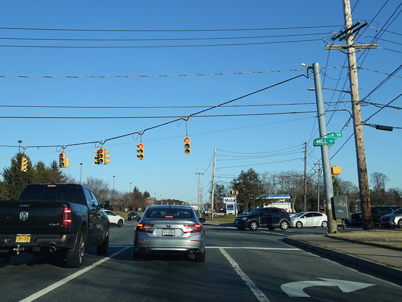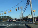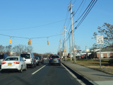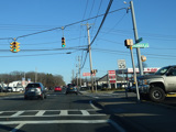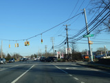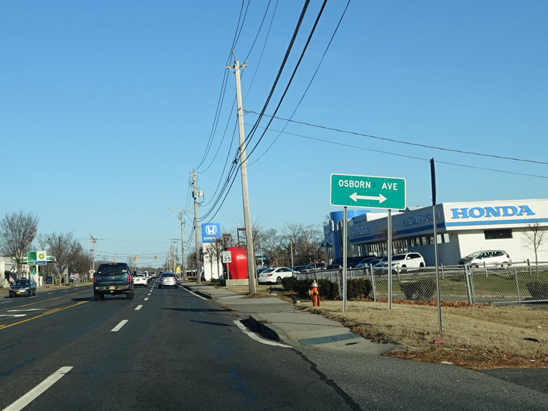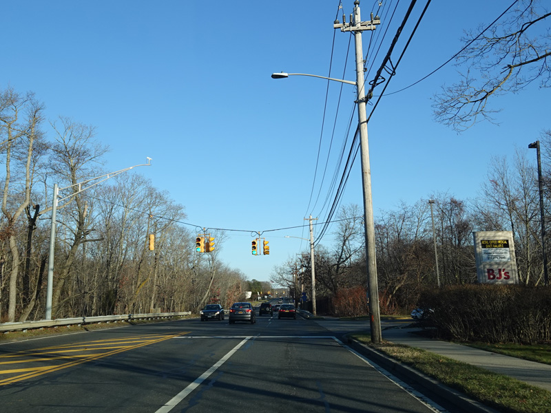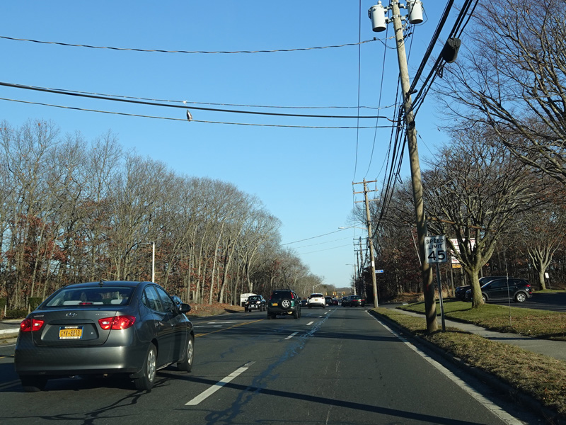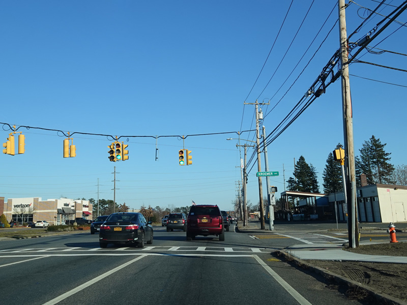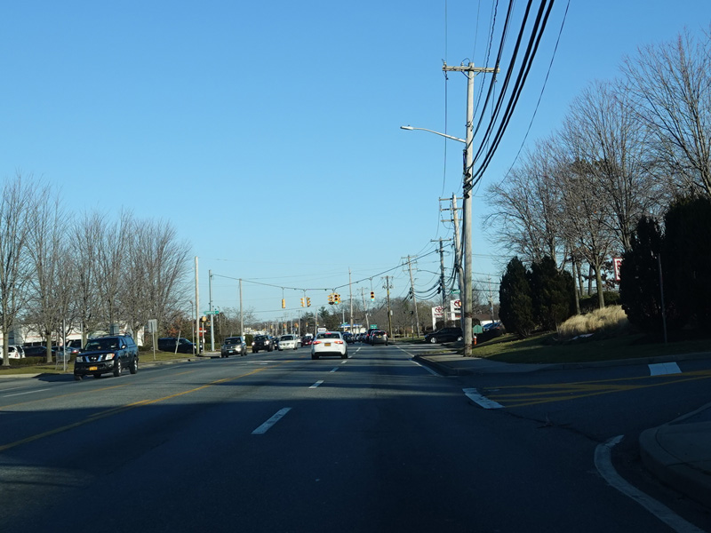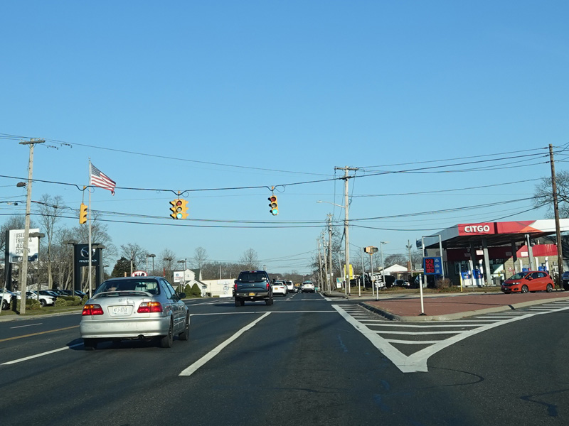 Old Country Road runs east as a four-lane undivided road. There are traffic lights at Mill Road, Pulaski Street, Osborn Avenue, and Harrison Avenue.