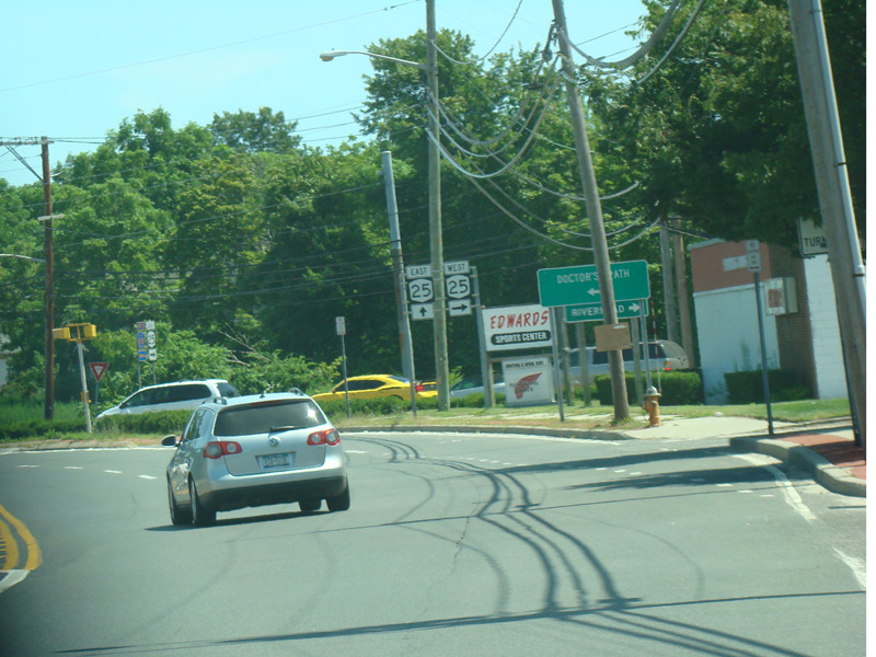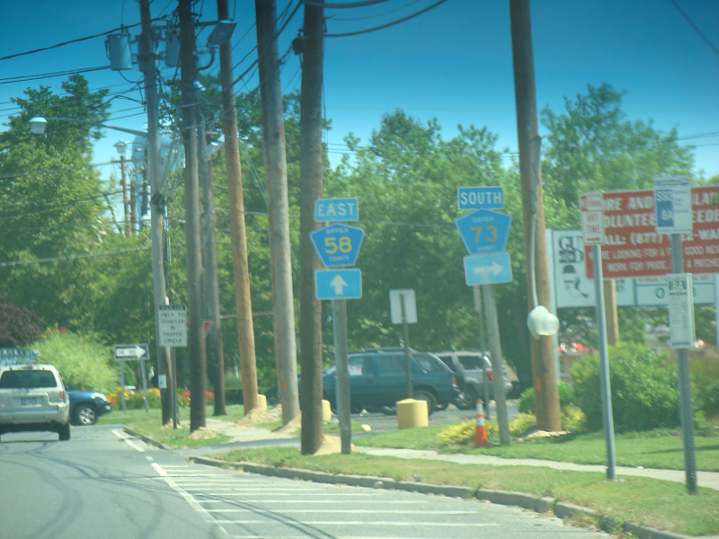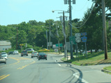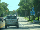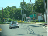 These pictures show the eastern portion of Old Country Road as it appeared in 2009. It has since been widened to four lanes, and most of the signs shown have been replaced.