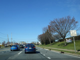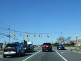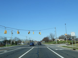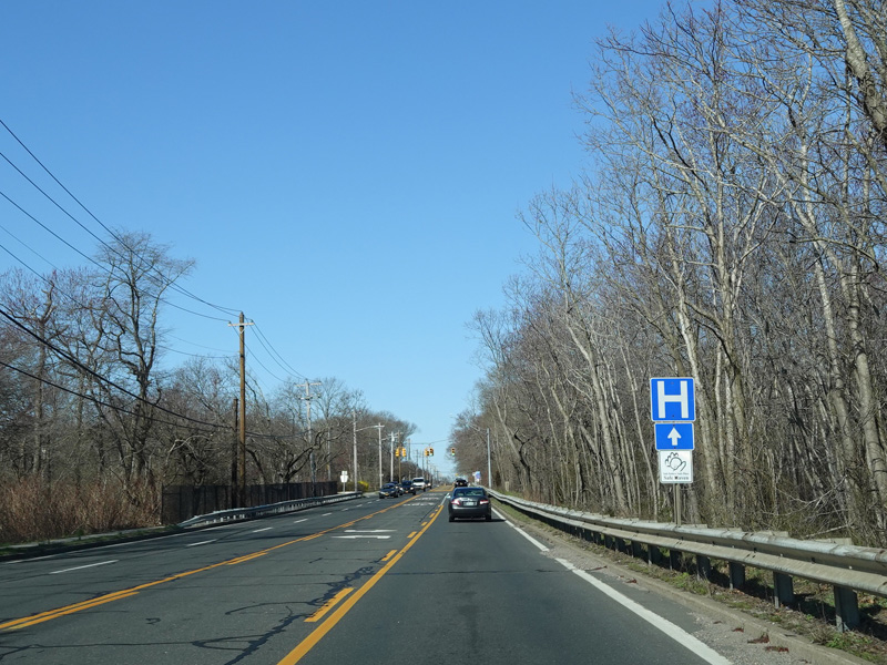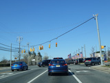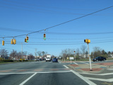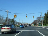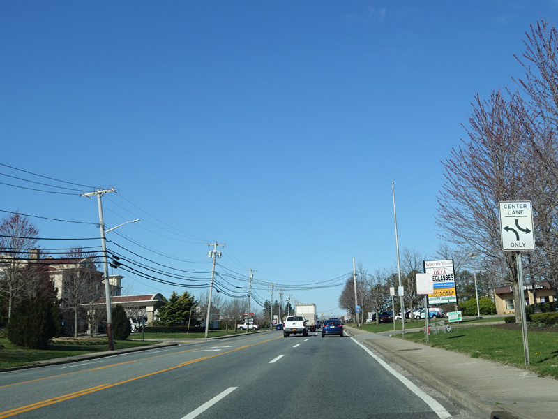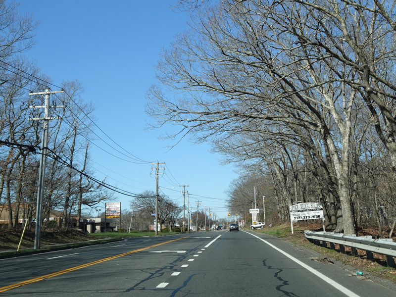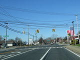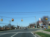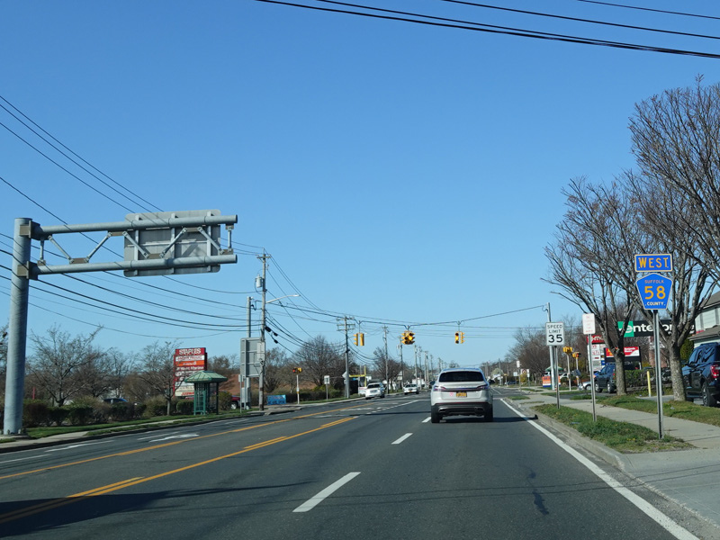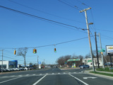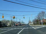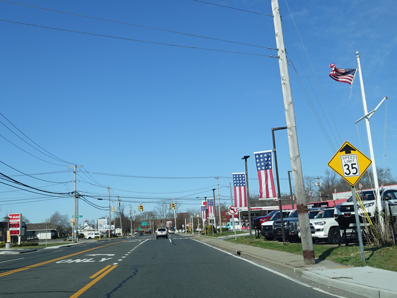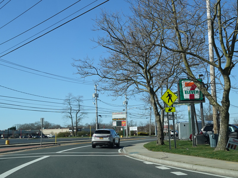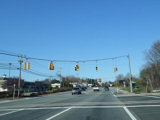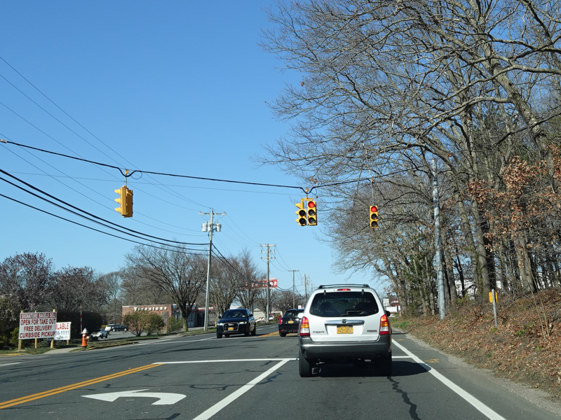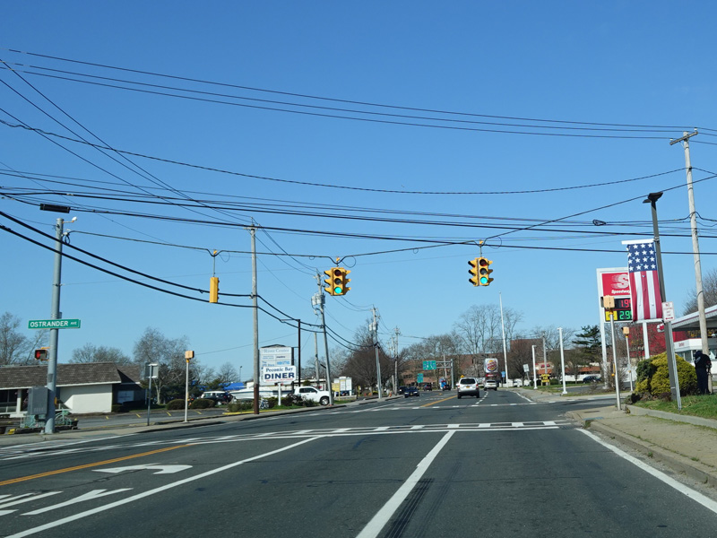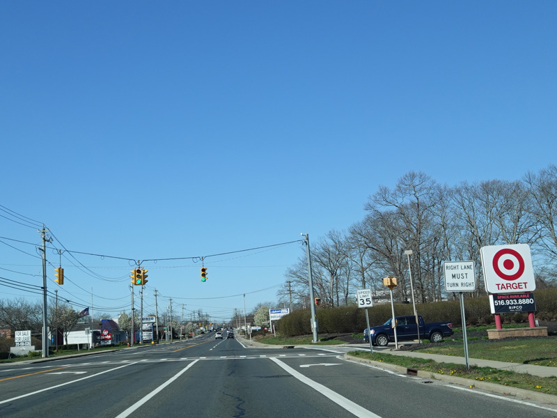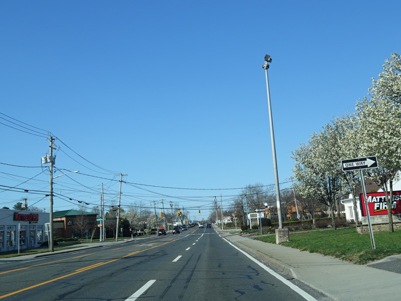 Old Country Road widens to four lanes. There are traffic lights at Pulaski Street and Mill Road.