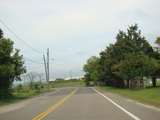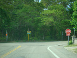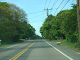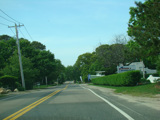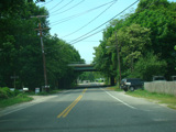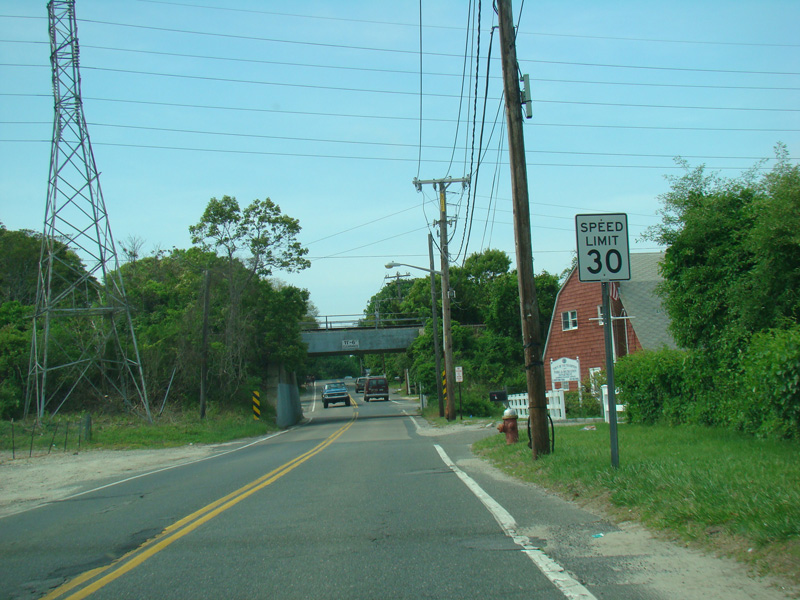 Newtown Road begins at Montauk Highway (CR 80) in Hampton Bays and runs north as a two-lane undivided road. It passes under the railroad tracks and then under Sunrise Highway (NY 27), but there is no interchange.
