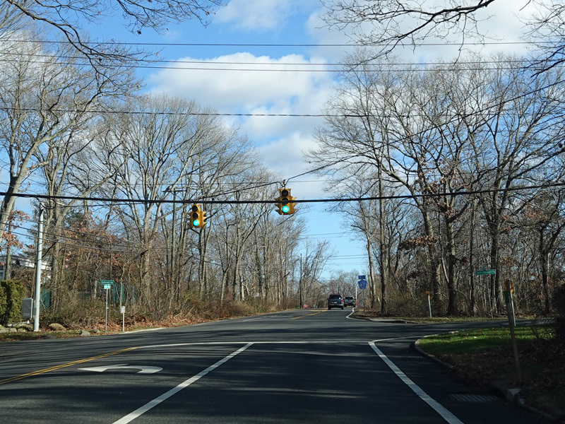 The Vanderbilt Parkway runs east as a two-lane undivided road. There is a traffic light at Carlls Straight Path.