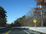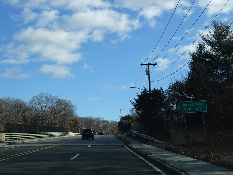 The Vanderbilt Parkway passes over the Sagtikos Parkway. Immediately thereafter, Harned Road begins on the left at a traffic light.