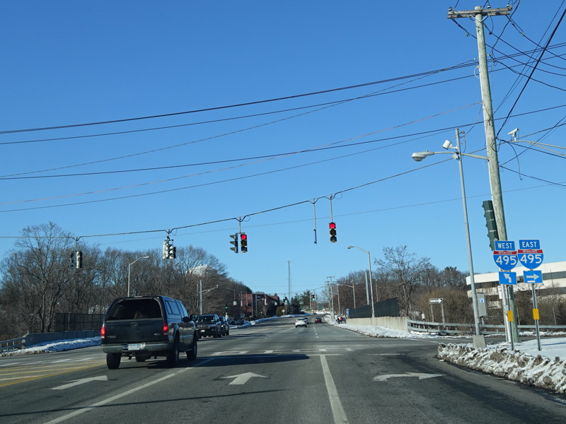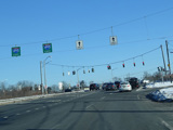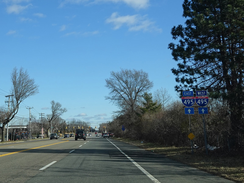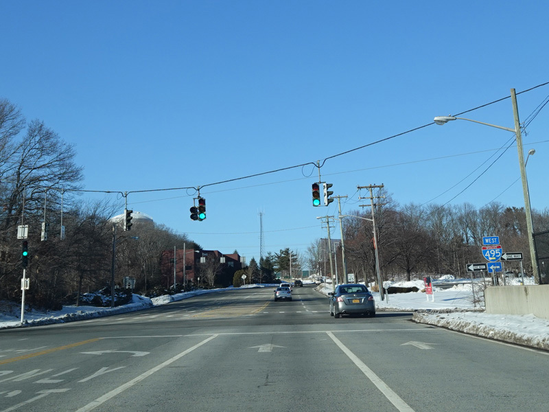 The Motor Parkway widens to four lanes and curves to the north. There is a pair of traffic lights at the service roads of the Long Island Expressway (I-495) near exit 57.