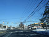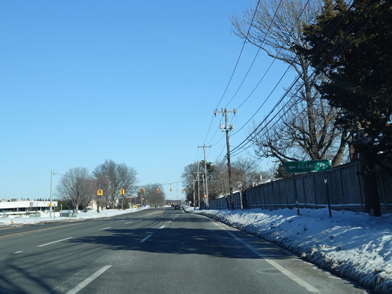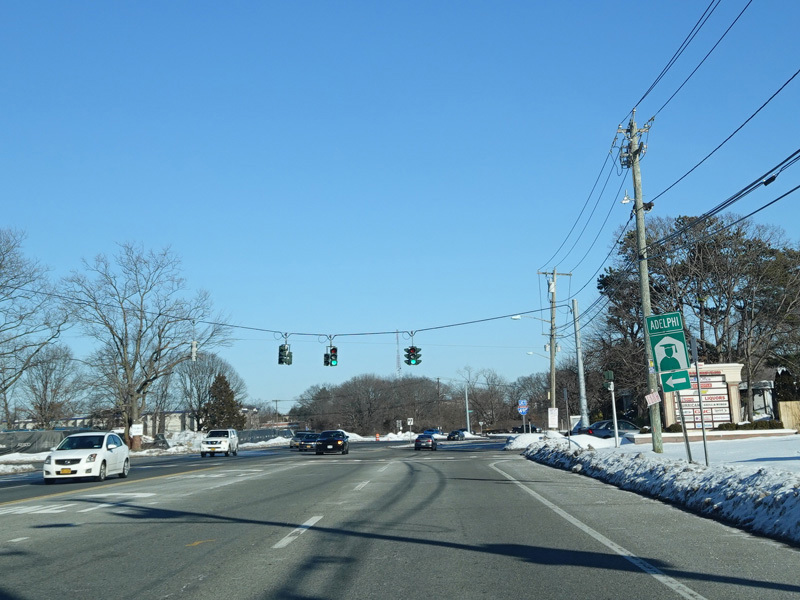The Motor Parkway runs east as a four-lane undivided road. There are traffic lights at Adams Avenue and Washington Avenue.