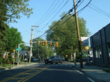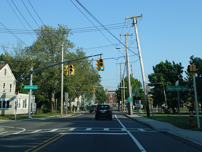 There is a pair of traffic lights separated by a railroad crossing. Turn left at the first light for Northville Turnpike (CR 43), which begins here. There is no county route signage at this intersection.