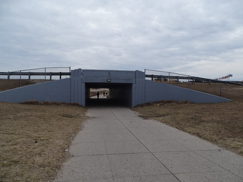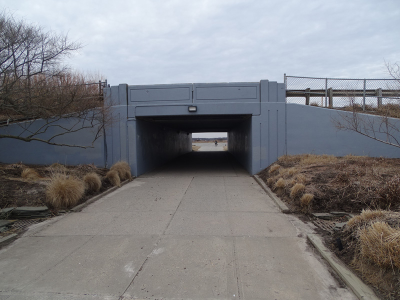 A pedestrian underpass crosses Fire Island Beach Road, connecting the parking lot to the beach at Smith Point Park.