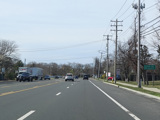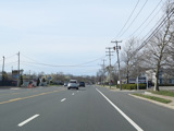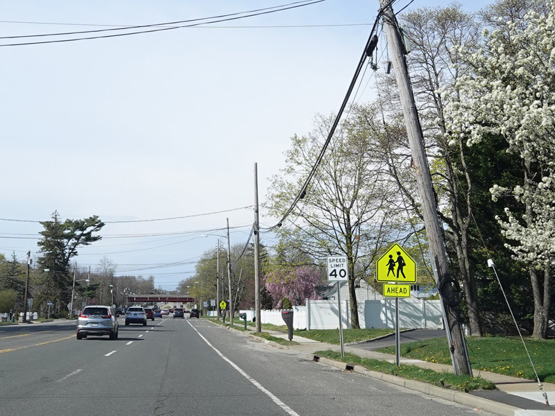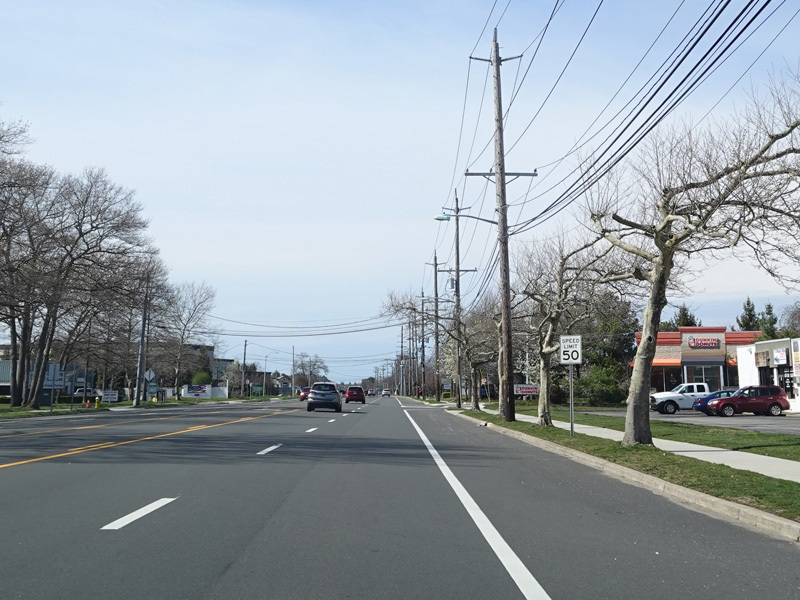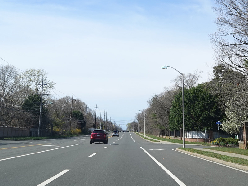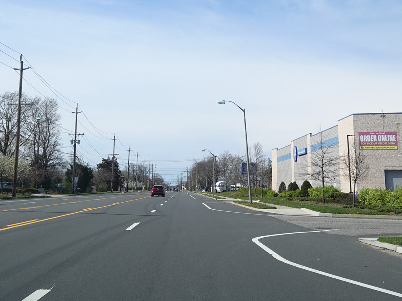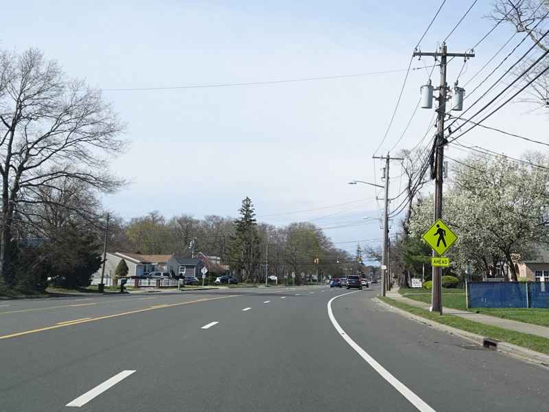 Lakeland Avenue becomes a county route upon crossing Sunrise Highway (NY 27) and runs north as a four-lane undivided road.