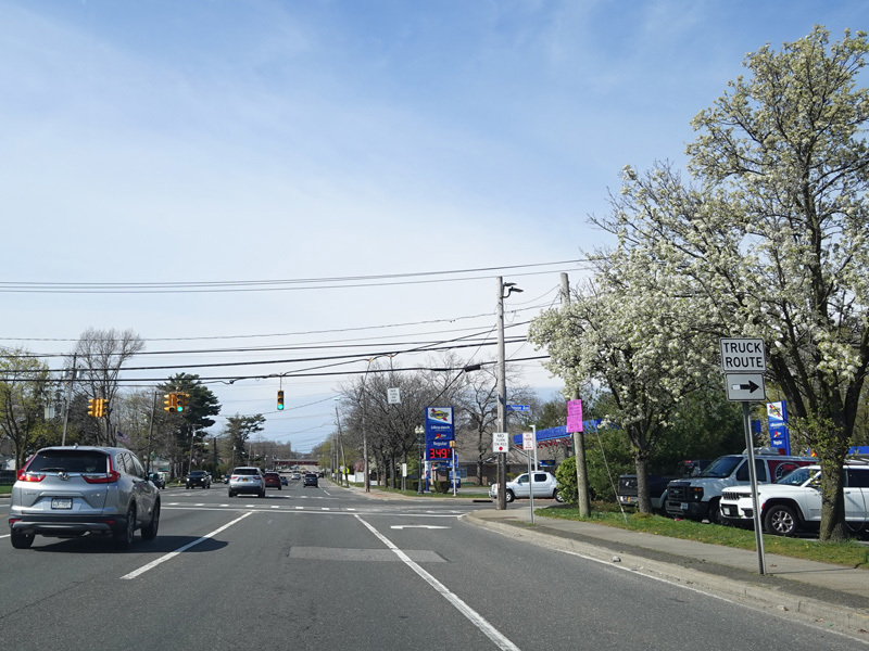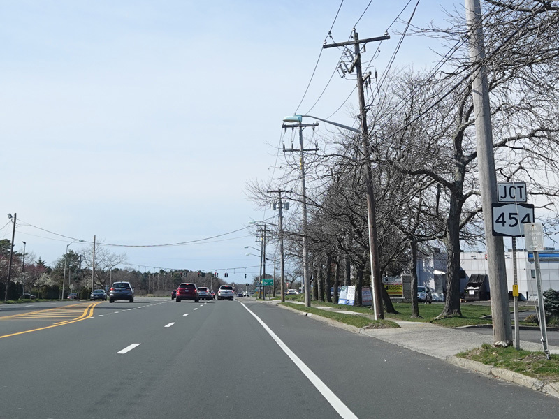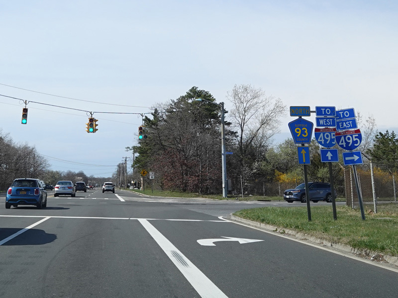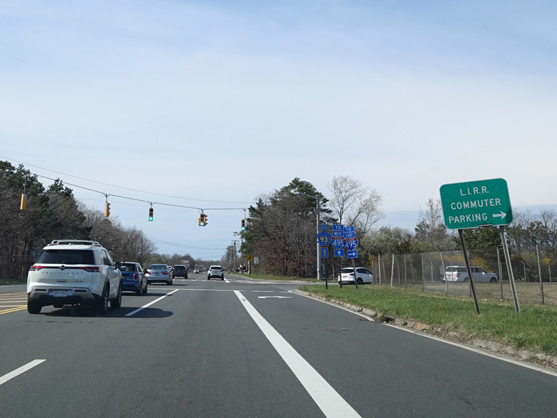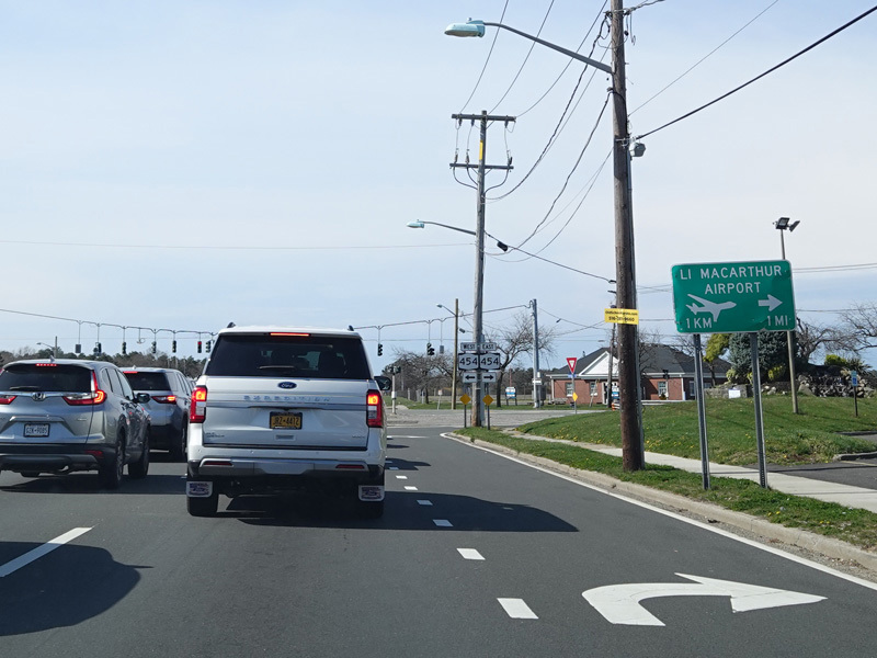 There is a traffic light at Veterans Highway (NY 454). Turn right to go east or left to go west.
