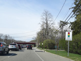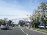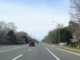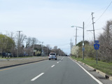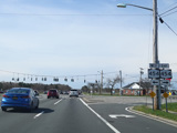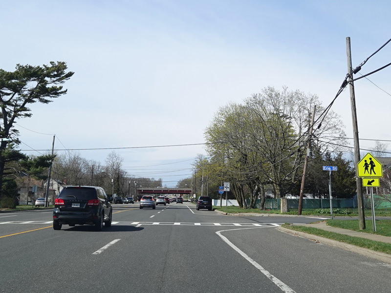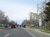 Ocean Avenue runs north as a four-lane undivided road. There is a railroad crossing at the Main Line of the Long Island Rail Road.