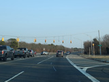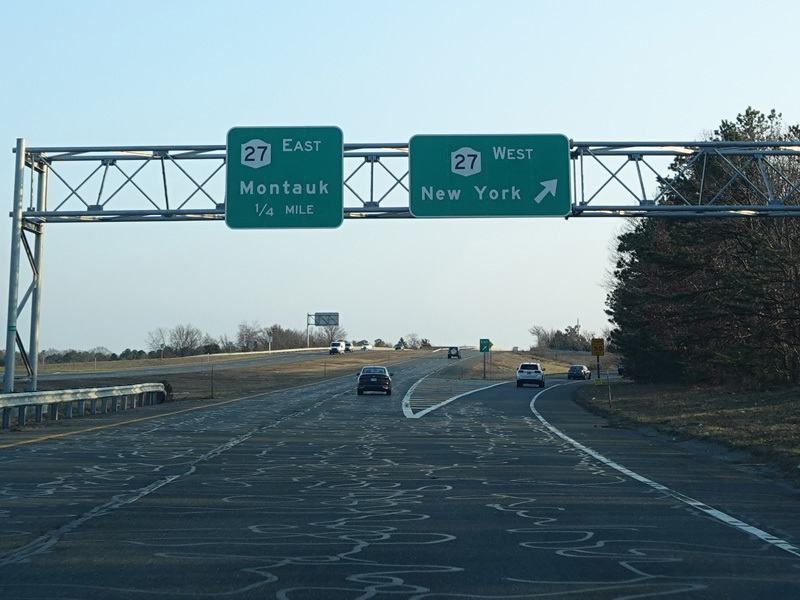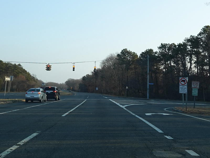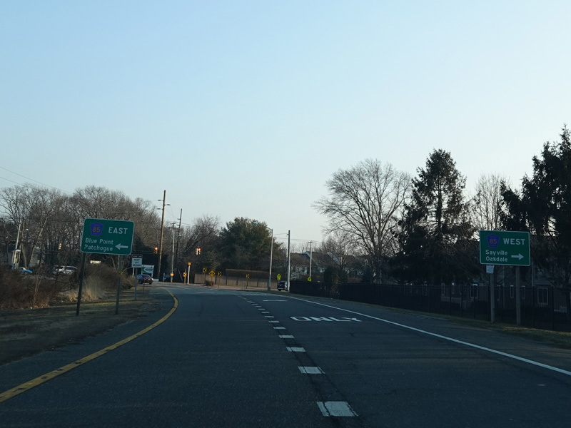 Nicolls Road ends at a traffic light at Montauk Highway (CR 85) in Blue Point. Turn right to go west or turn left to go east.