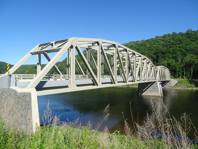 High Road begins at the Pond Eddy Bridge, a one-lane bridge with a wooden deck crossing the Delaware River between New York and Pennsylvania. The area on the Pennsylvania side does not connect with any other roads in Pennsylvania; it can only be accessed through New York via the bridge. On the New York side of the bridge, High Road intersects NY 97 and then continues north for a couple of miles to Glen Spey, where it ends at Proctor Road (CR 32) and Forestburgh Road (CR 42).