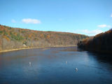 This picture shows the Delaware River looking north as observed from walking across the Pond Eddy Bridge.