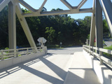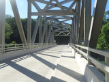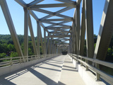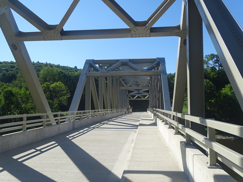 The Pond Eddy Bridge crosses the Delaware River from Pennsylvania to New York. It is a one-lane bridge with a wooden deck.