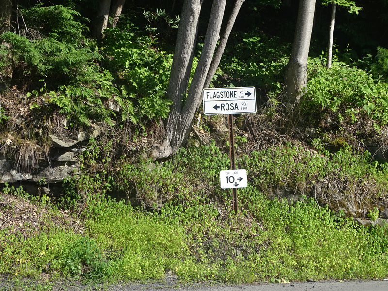 The roadway ends on the other side of the bridge. Turn right for Flagstone Road or left for Rosa Road.