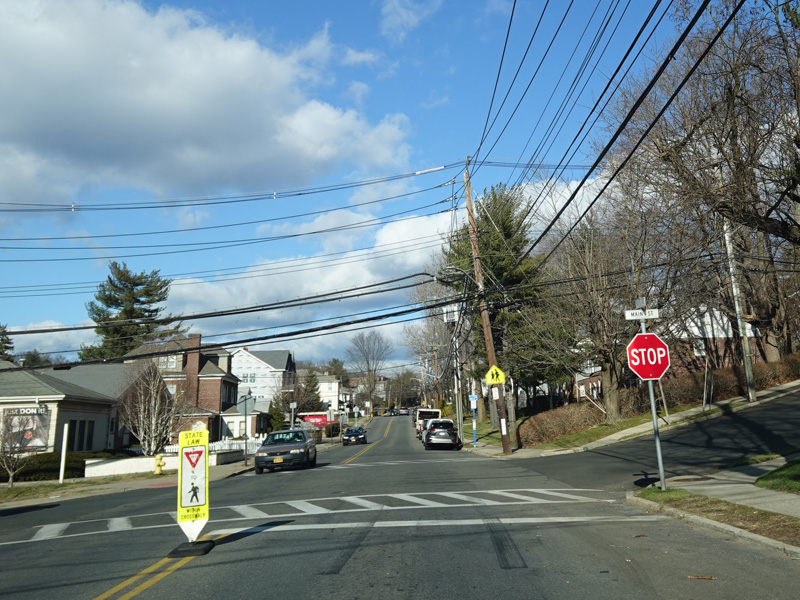 Underhill Avenue begins at Columbus Avenue just north of Westchester Avenue (CR 62), the service road of the Cross Westchester Expressway (I-287). It runs north as a two-lane undivided road. There is a stop sign at Main Street, followed by a traffic light at Madison Street.