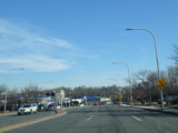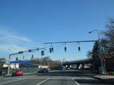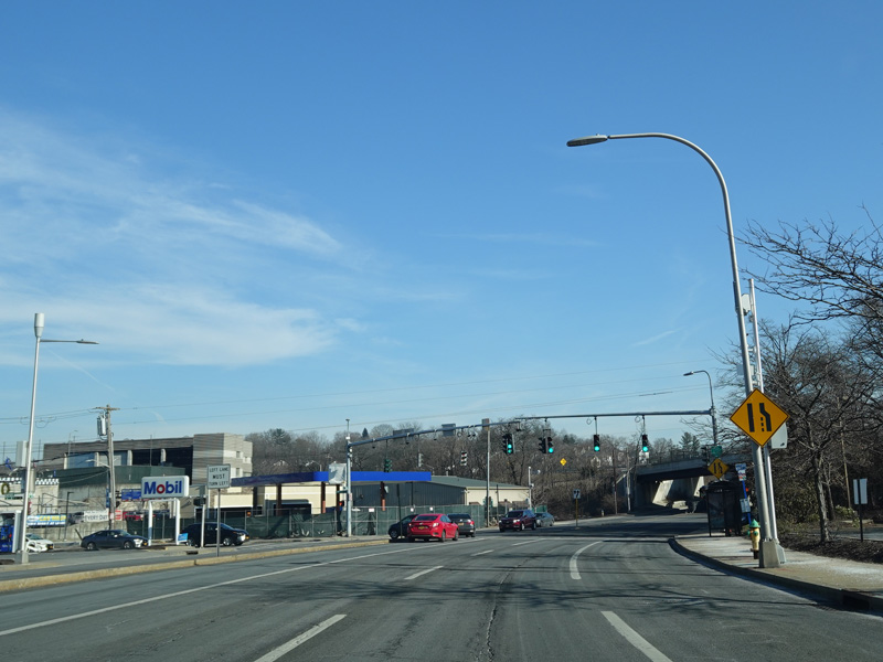 Westchester Avenue begins at North Broadway (NY 22) in White Plains and runs east as a six-lane divided road. There are traffic lights at Paulding Street and Bloomingdale Road. The Westchester Mall is along the right.