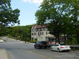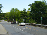 A small bridge carries Ardsley Road over the Bronx River. On the other side of the bridge, Ardsley Road becomes Popham Road, a local street.