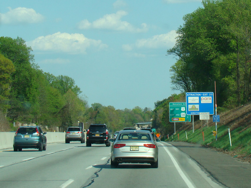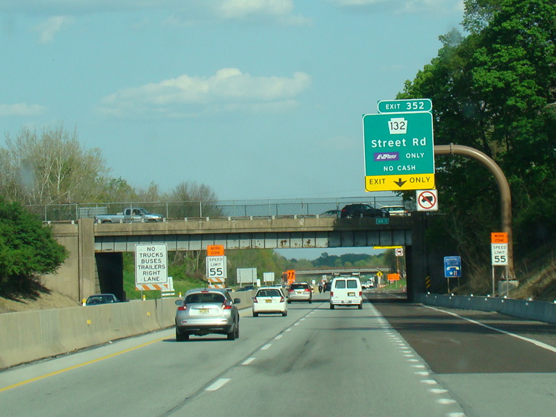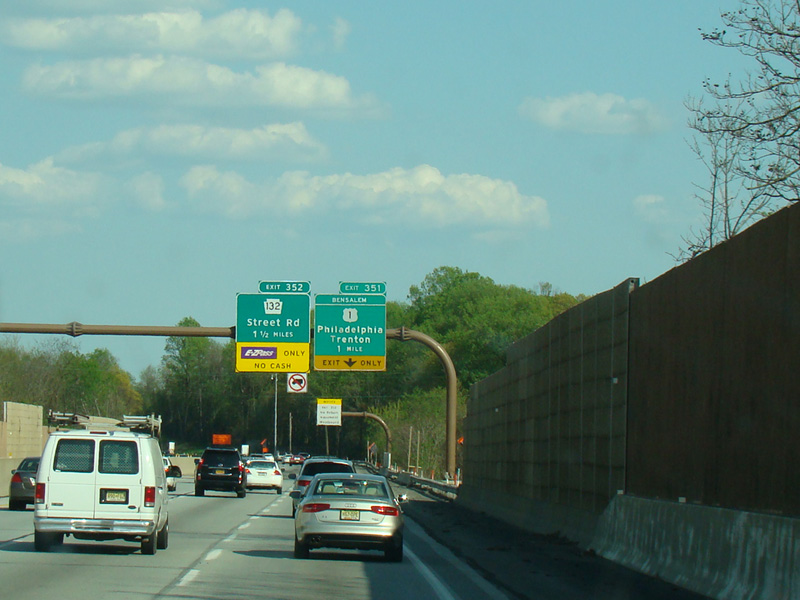 These pictures show the Pennsylvania Turnpike at exits 351-352 as it appeared in 2015. At the time, exit 352 was restricted to motorists with E-ZPass. This restriction was removed when the turnpike was converted to cashless tolling. The signage for exit 351 was also enhanced to more prominently announce that access to I-95 south and I-295 east is through this exit.