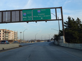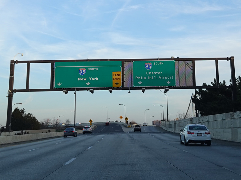 The ramp from the Vine Street Expressway and the Ben Franklin Bridge to the Delaware Expressway (I-95) splits. Bear left to go north or right to go south.