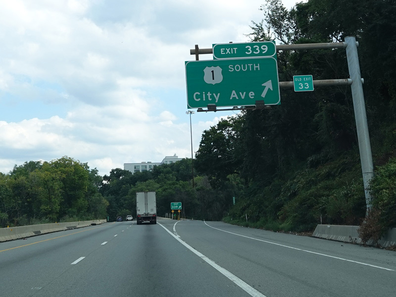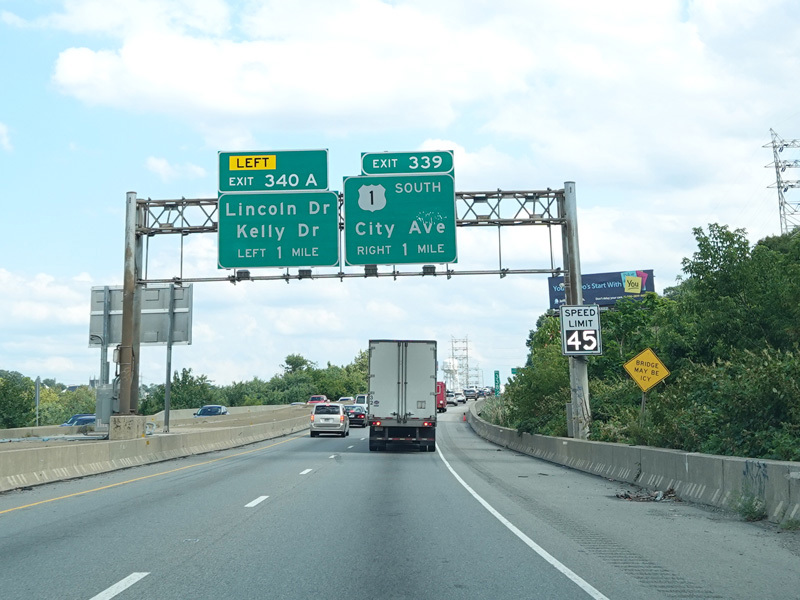 Exit 340A is for Lincoln Drive and Kelly Drive. Exit 339 is for City Avenue (US 1) south. The two exits are out of order in this direction.