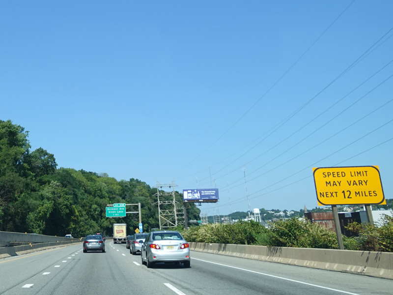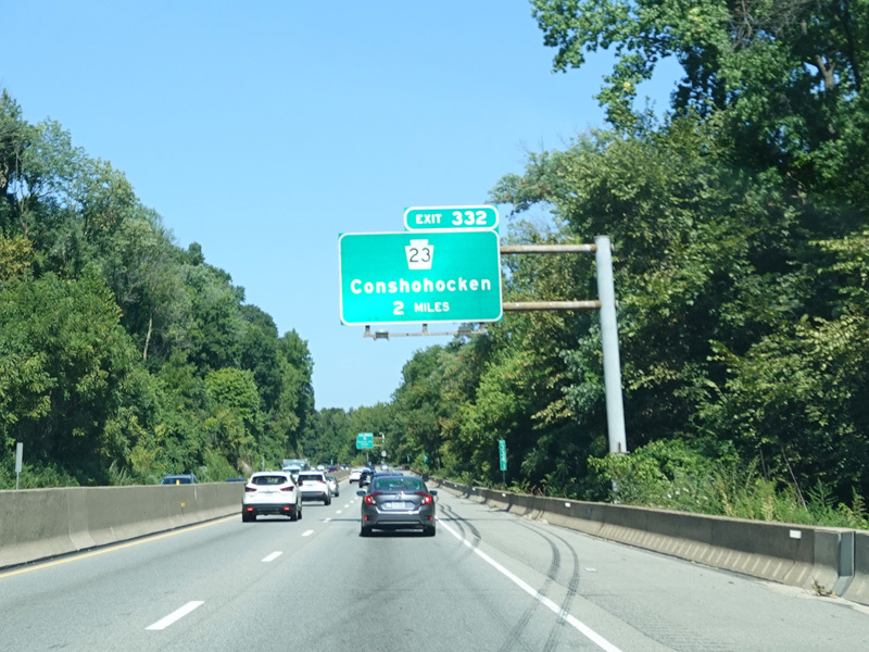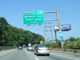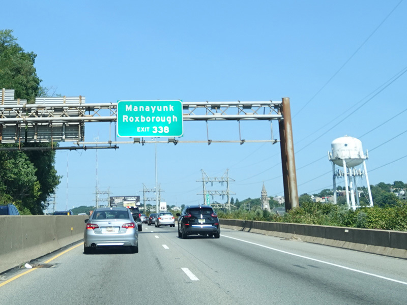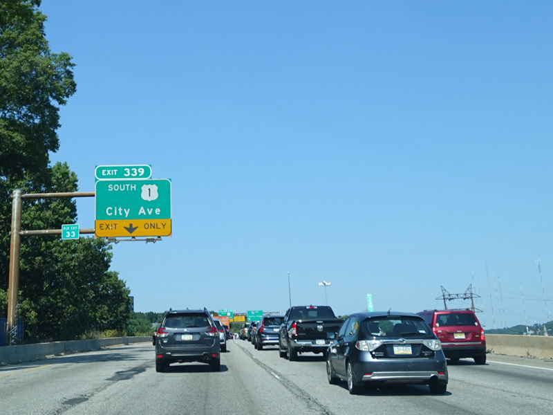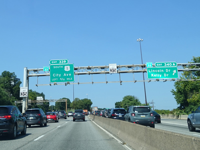 The lanes merging in from the left are separated by a divider. Exit 340A is for Lincoln Drive and Kelly Drive. Exit 339 is for City Avenue (US 1) south.
