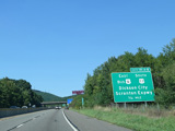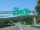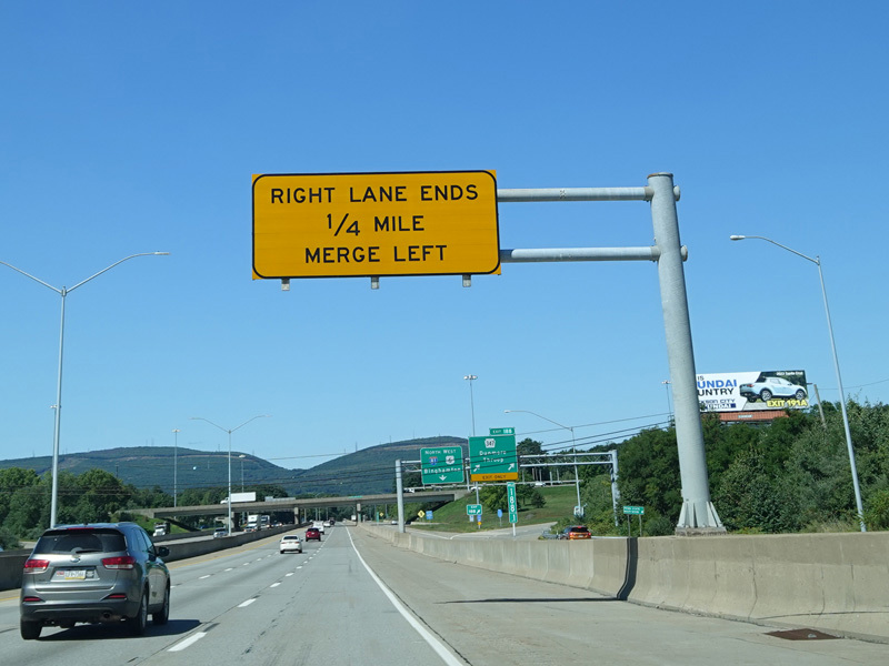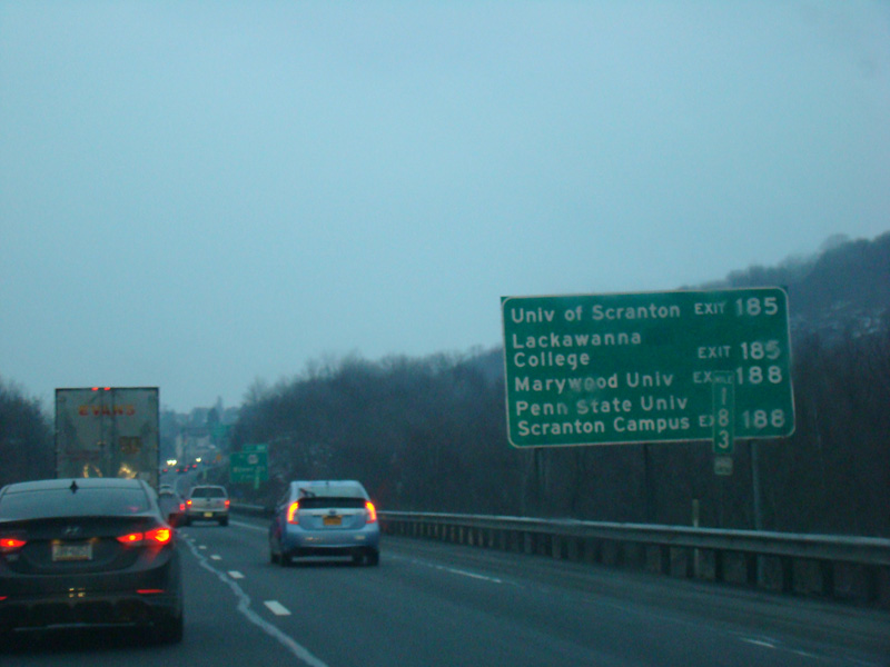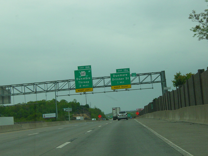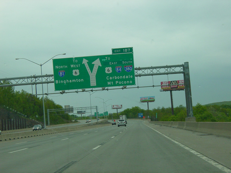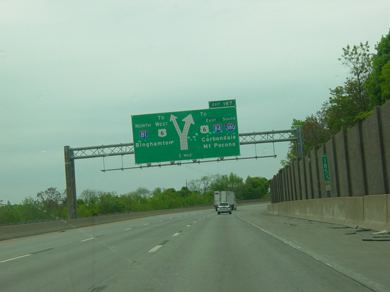 Exit 187 is for I-84/I-380 and the Lackawanna Valley Industrial Highway (US 6) east. Exit 186, which is an exit from the ramp for exit 187, is for Drinker Street.