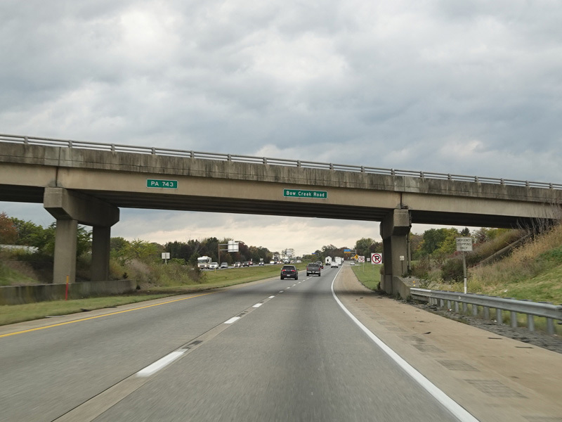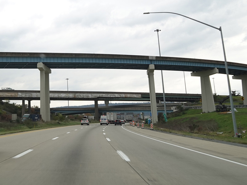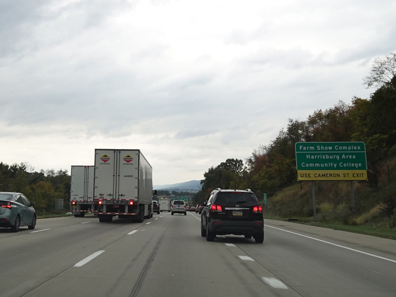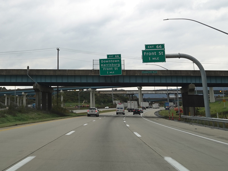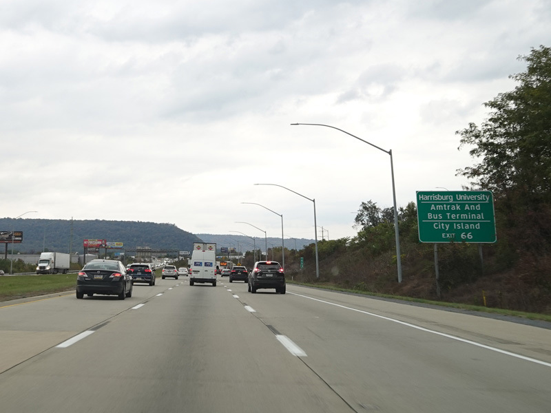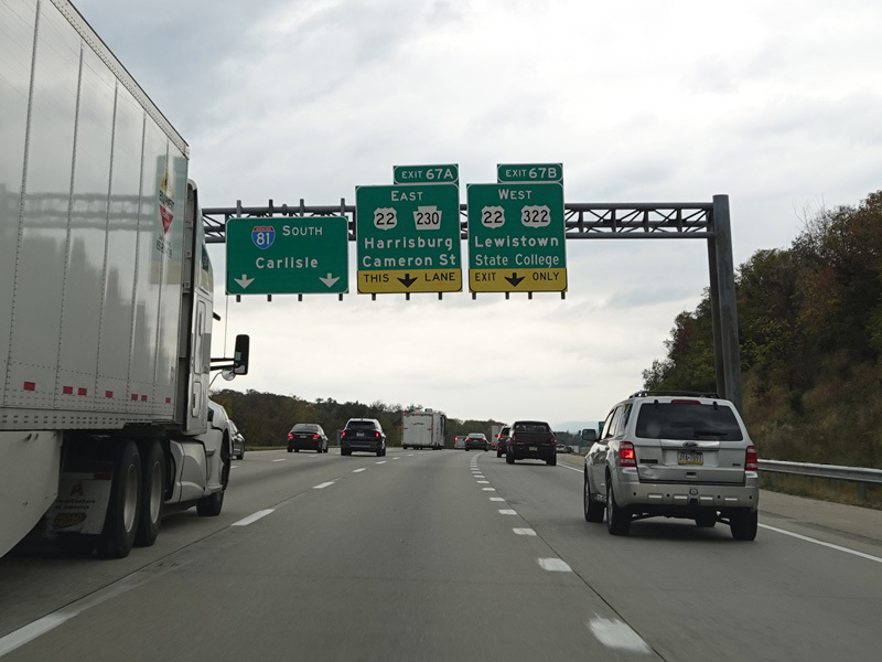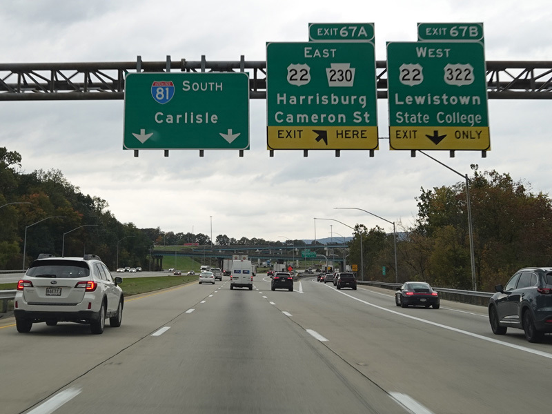 Exits 67B-A are for US 22 and Cameron Street (PA 230). US 322 splits off here and is multiplexed with US 22 to the west.