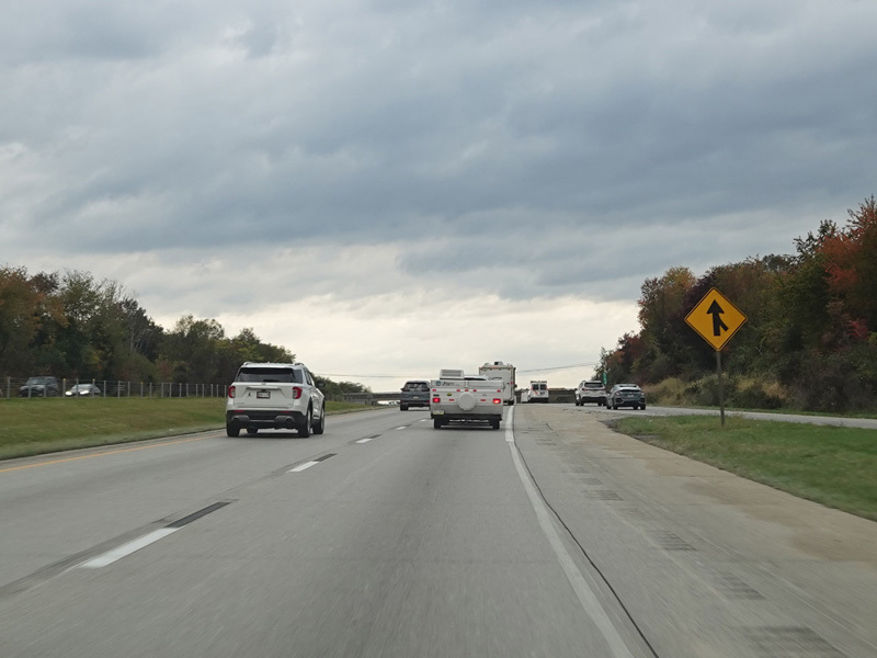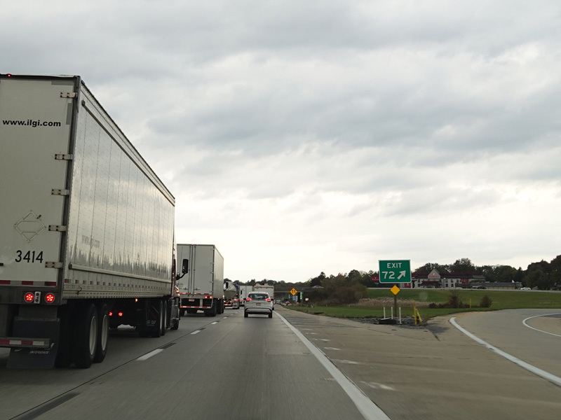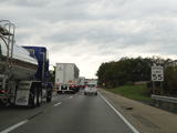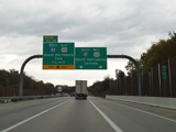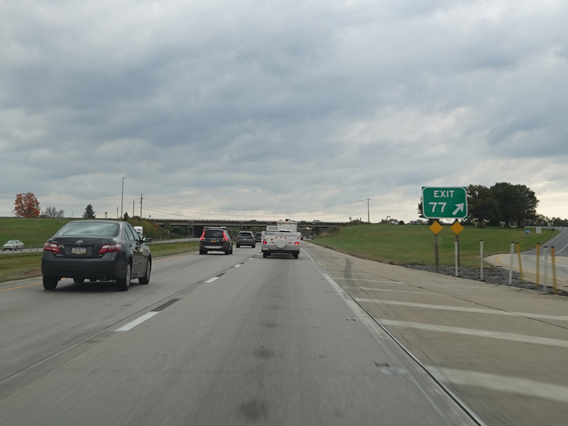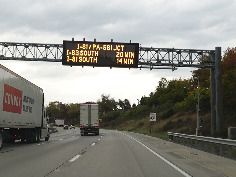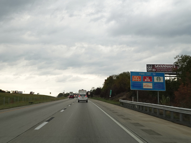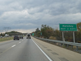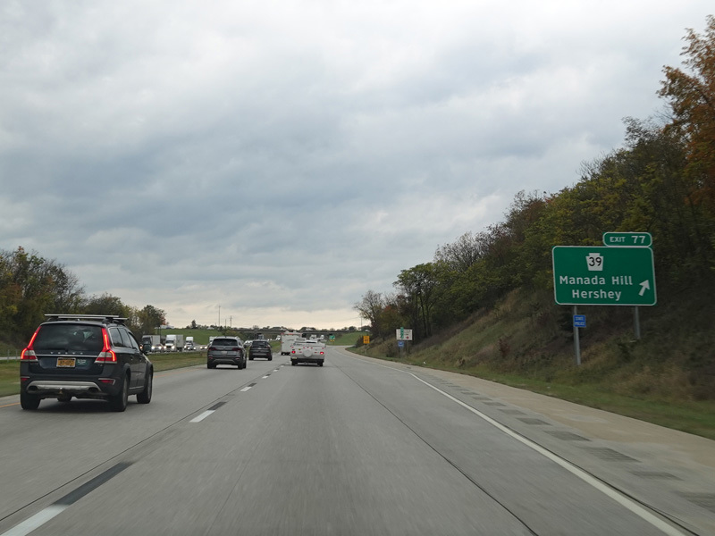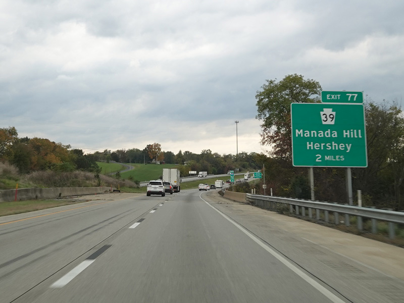 Exit 70 is for I-83 south. The left lane is an exit only lane here. US 322 is multiplexed with I-83 to the east and with I-81 straight ahead to the west.