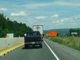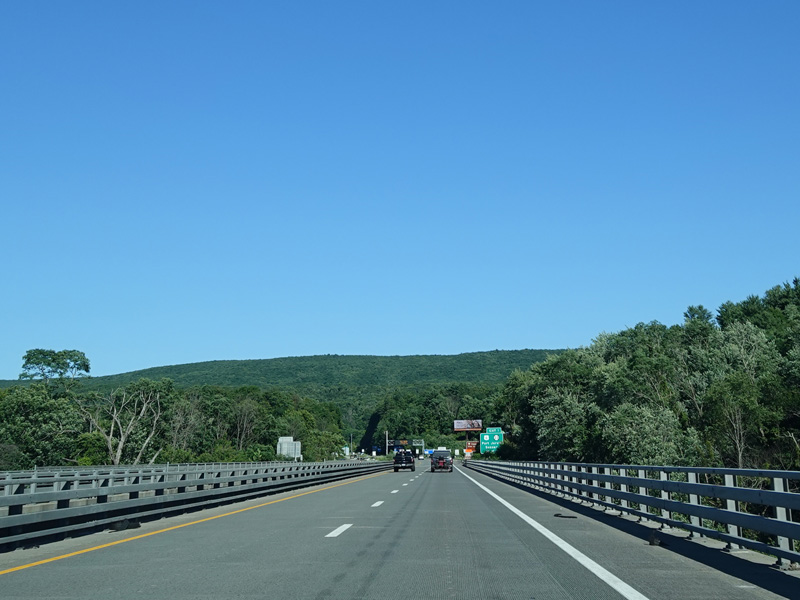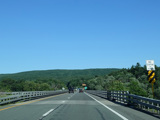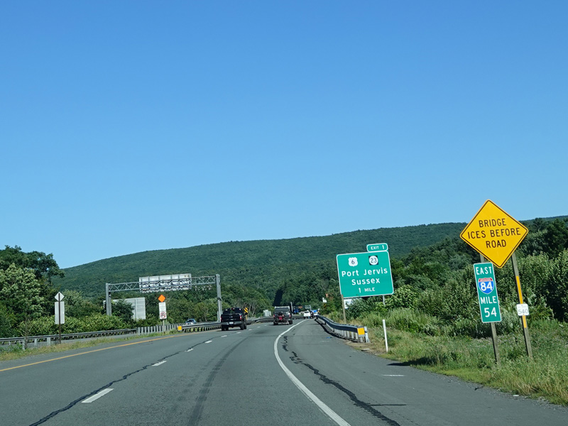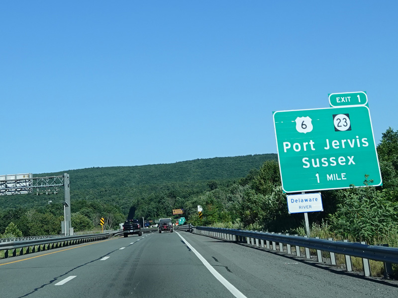 Approaching the state line, there is advance signage for exit 1 in New York, which is for US 6 and NJ 23. The sign is in Pennsylvania, the exit is in New York, and it references a state route in New Jersey. Straight ahead, there is a bridge over the Delaware River to New York.