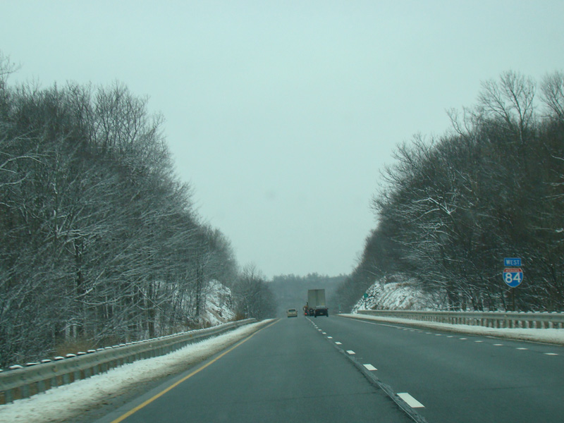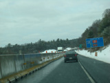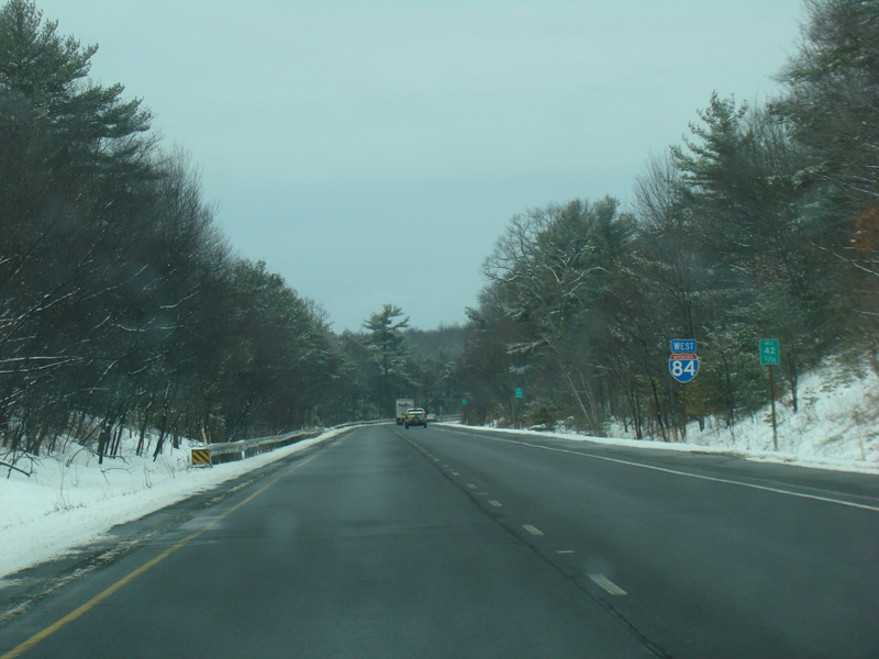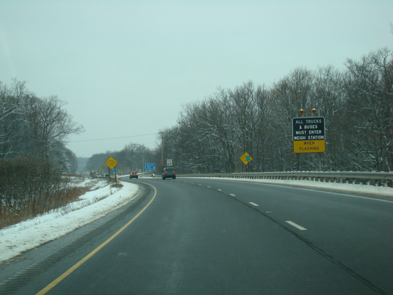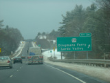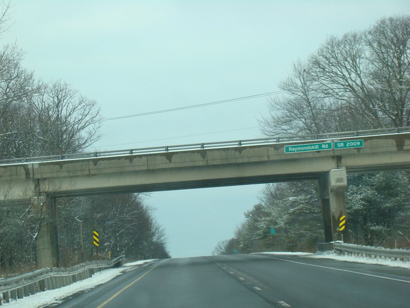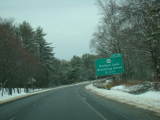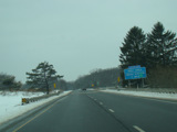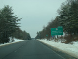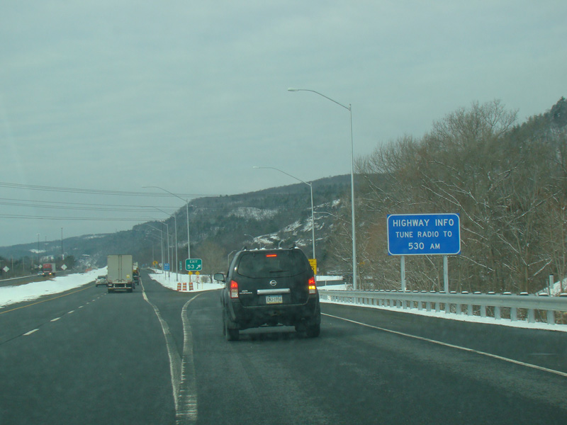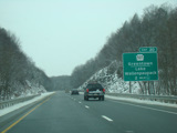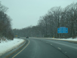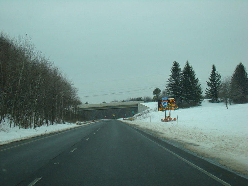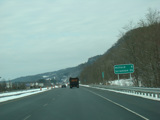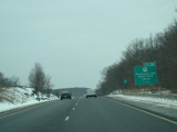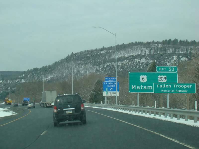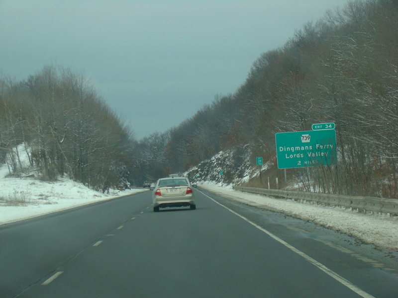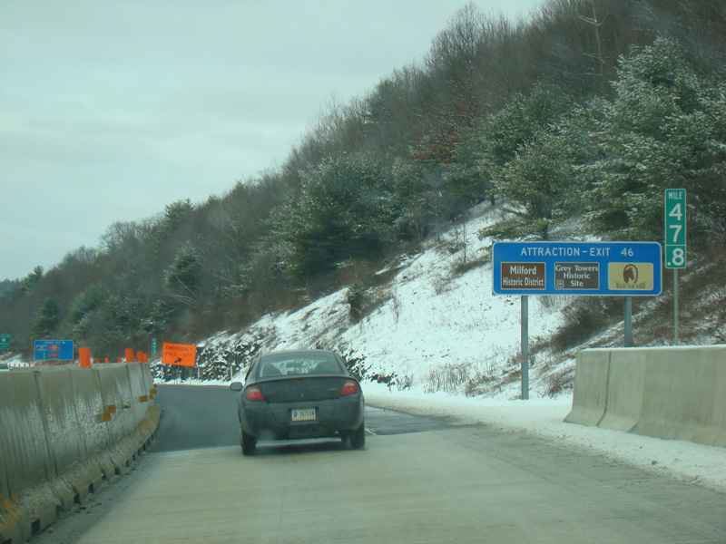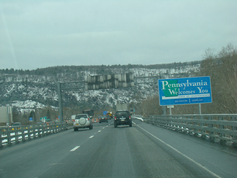 Welcome to Pennsylvania! A small bridge carries I-84 across the Delaware River from New York. Exit 53 is for Pennsylvania Avenue (US 6/US 209). Most of the signage for this exit is on the New York side of the bridge.