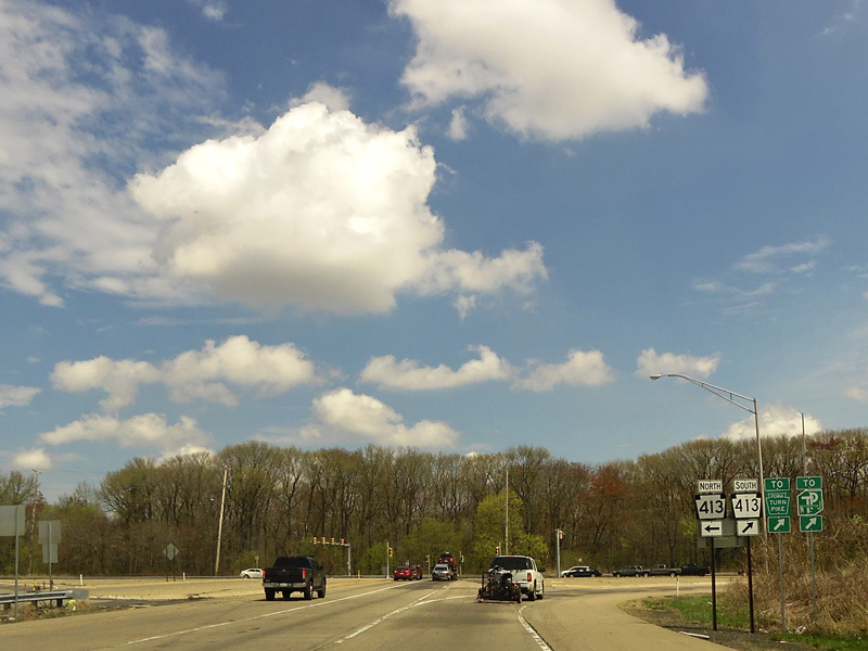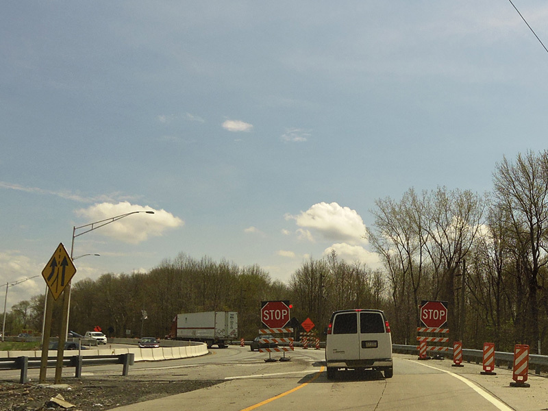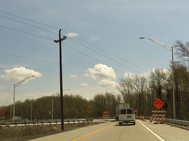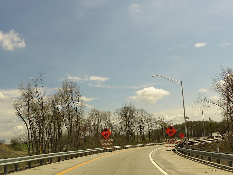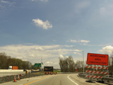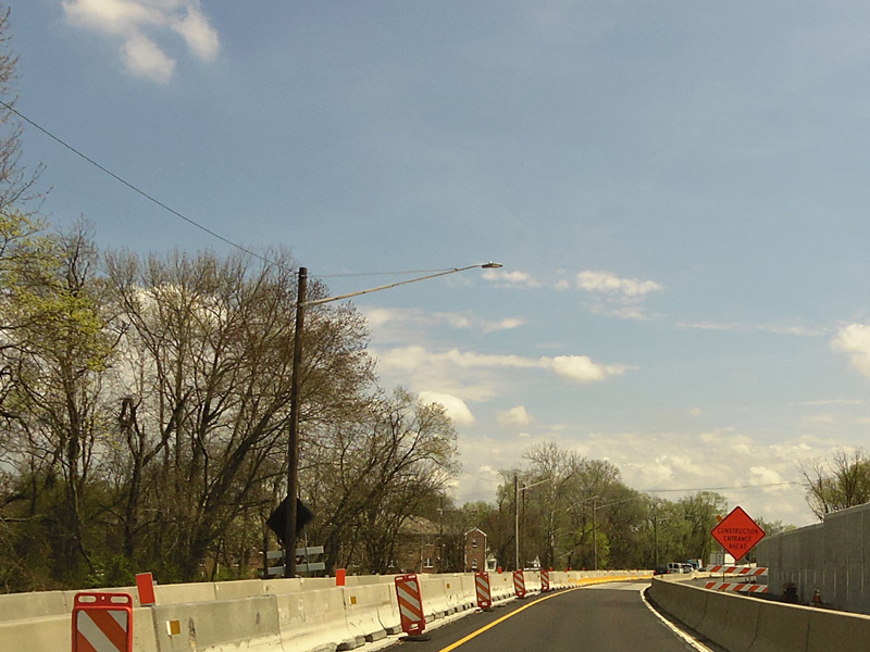 These pictures show the ramp for exit 42 as it appeared while construction work was in progress to eliminate the grade-separated interchange with Bristol Pike (US 13) and replace it with a traffic light. This took place after the gap in I-95 was closed, leaving this interchange overpowered now that it no longer needs to carry traffic between the two highways to compensate for the lack of a direct connection.
