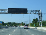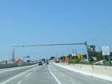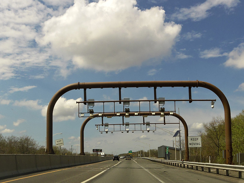 This picture shows the cashless tolling gantry for the Delaware River Bridge as it appeared before a sign was added giving the milepost at the top.