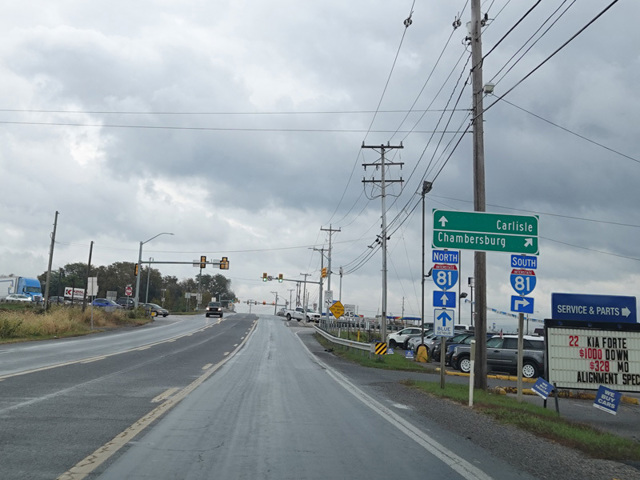 PA 174 is an east/west route in Cumberland County. The first section is known as Walnut Bottom Road. It begins at East King Street (US 11) in Shippensburg and runs east to an interchange with I-81. It continues to the northeast after the interchange. In Carlisle, PA 174 splits off to the east onto Old York Road, while Walnut Bottom Road continues northeast as PA 465. In Boiling Springs, Old York Road changes names to become First Street. Heading out of town, it becomes Boiling Springs Road. After crossing York Road (PA 74), Boiling Springs Road curves to the north to end at West Trindle Road (PA 641) in Mechanicsburg.