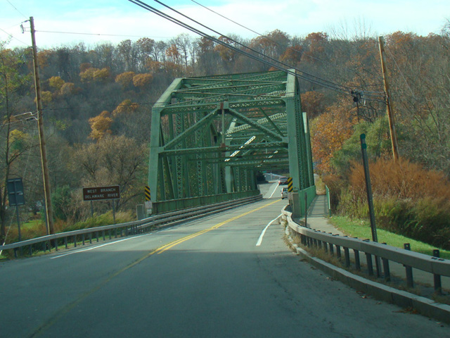 PA 191 follows Bangor Road and Washington Boulevard north to Bangor. Passing through Bangor, PA 191 becomes South 1st Street, North 1st Street, and Roseto Avenue. It continues north as Valley View Drive and Mountain Road to Stroudsburg, where it has a partial interchange with the Keystone Shortway (I-80). PA 191 runs northwest along Paradise Creek. It is known as Paradise Trail and Paradise Valley Road in this area. It turns north and continues through the Poconos, eventually reaching I-84 and having an interchange with it. It is multiplexed with PA 196 for a few miles along Easton Turnpike and then splits off to the northeast toward Honesdale. There, it is multiplexed with US 6 along a pair of parallel one-way streets for a few blocks. North of Honesdale, PA 191 is known as Hancock Highway. It ends at a bridge over the Delaware River to Hancock, New York. NY 97 is a few blocks away from the bridge and can be accessed through the local streets. However, there is no designation, not even a reference route or a county route, for this connection.