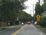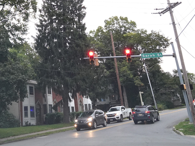 North 5th Street runs north as a two-lane undivided road. There is a traffic light at Sarah Street.