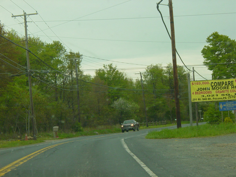 PA 196 ends here at this traffic light. Pocono Boulevard (PA 611) south is to the left. There is also access to PA 940. Bear left to go east or right to go west.
