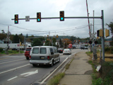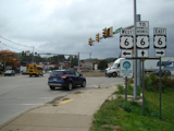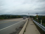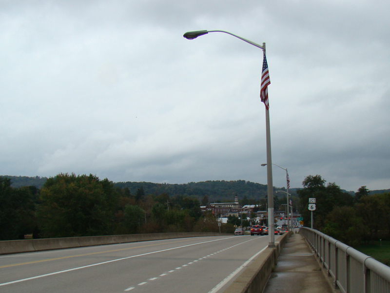 There is a bridge across the Susquehanna River. On the other side, there is a railroad crossing, immediately followed by a traffic light at US 6. Turn right to go east or left to go west.