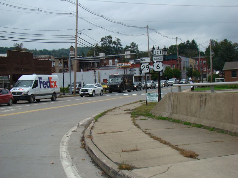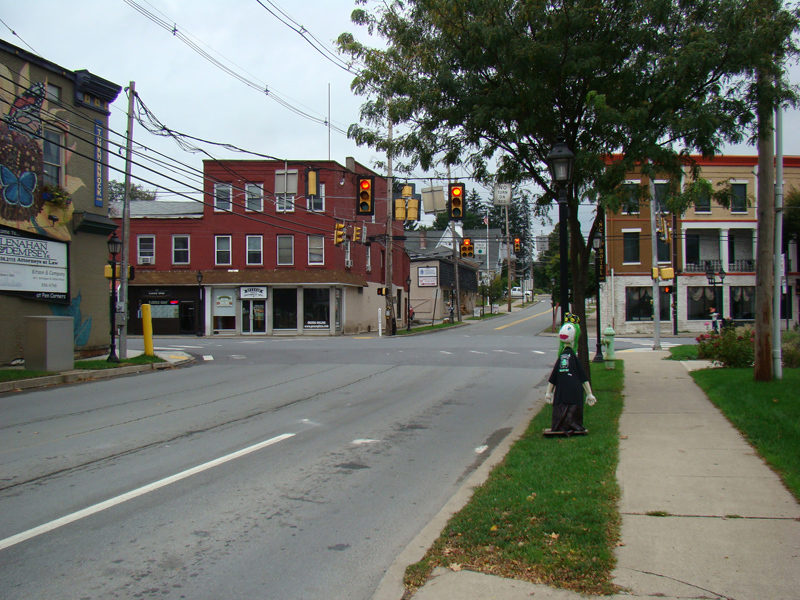 After one block, there is a traffic light at Business US 6. Turn right onto East Tioga Street to go east. Turn left onto West Tioga Street to go west.