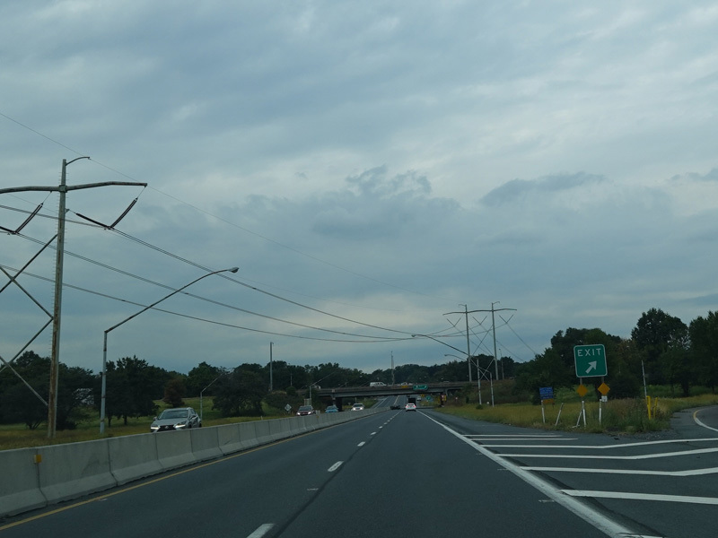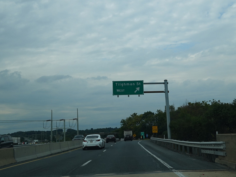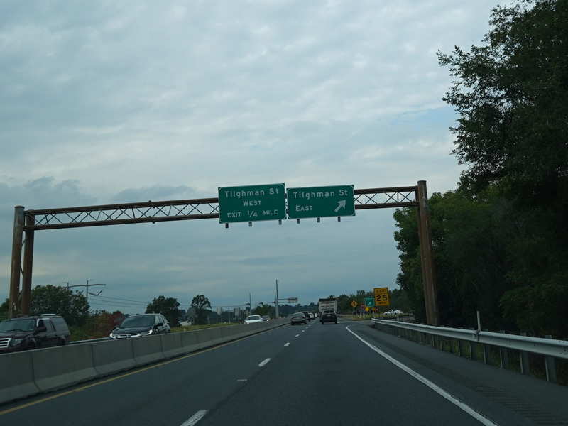 There is a pair of exits for Tilghman Street. The signage instructs motorists to get off here at the westbound exits for the connection to the Northeast Extension of the Pennsylvania Turnpike (I-476). Some genius at PennDOT thought that it made sense to have people make the connection through a surface road with traffic light, even though there is an expressway connection through the Lehigh Valley Thruway (US 22) at the next interchange.