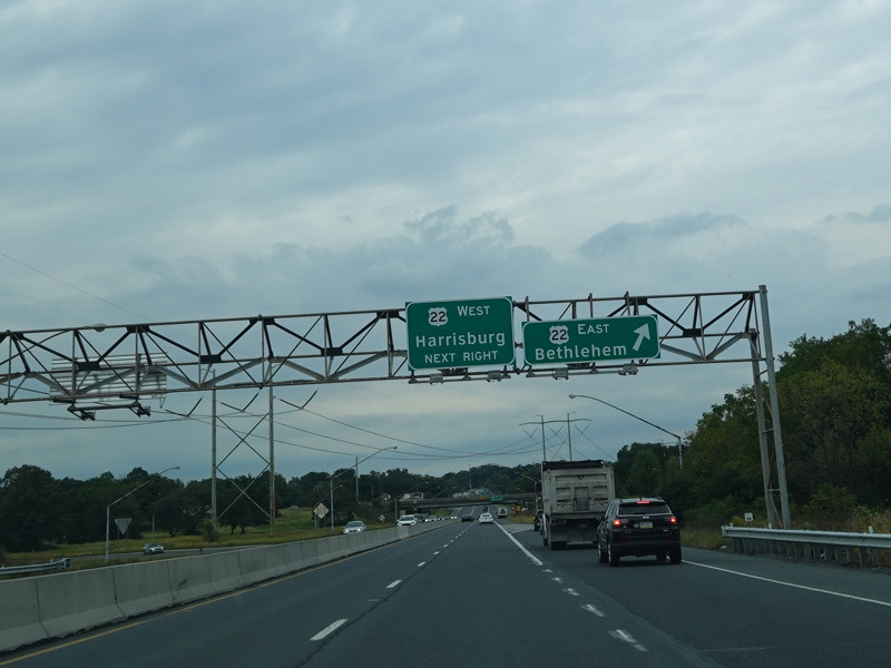 There is a pair of exits for the Lehigh Valley Thruway (US 22). Use the westbound exit for a connection to the Northeast Extension of the Pennsylvania Turnpike (I-476).