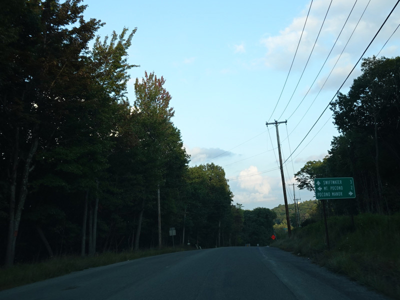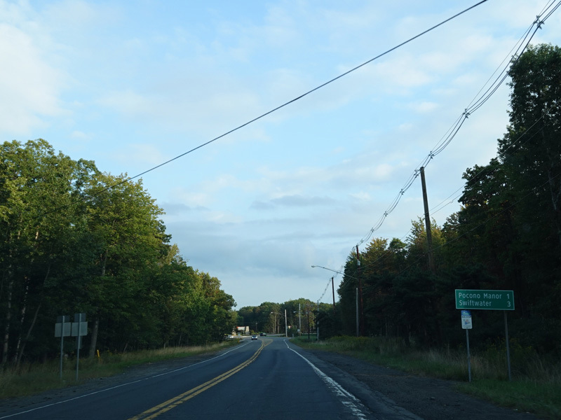 Manor Drive begins at PA 940 in Pocono Summit and runs east as a two-lane undivided road. There are a couple of resorts on the right.
