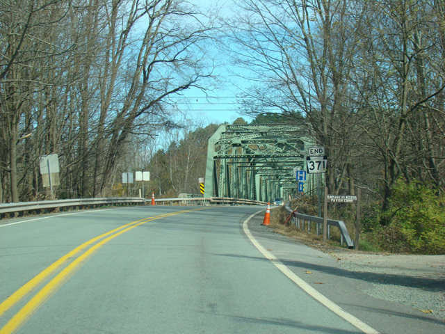 PA 371 is an east/west route in the northeastern corner of Pennsylvania. Old Newburgh Turnpike (PA 374) changes designation to become PA 371 upon crossing PA 171. It runs east, changing names twice to become Great Bend Turnpike and then Cochecton Turnpike. It eventually reaches the Delaware River, where there is a bridge to New York. It becomes Newburgh Turnpike (Sullivan CR 114) at the state line.