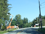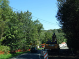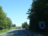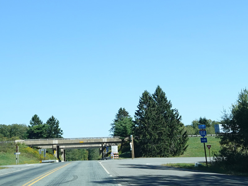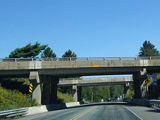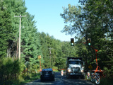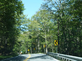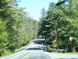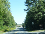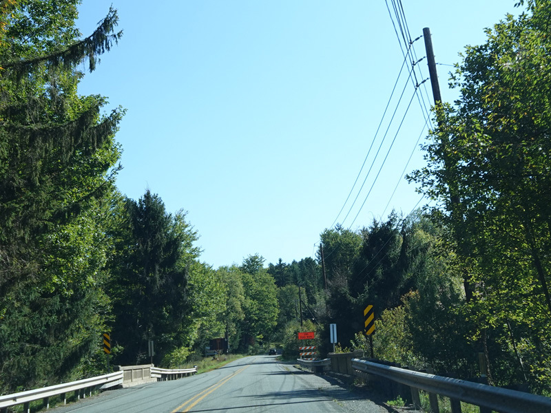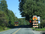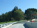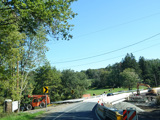 There is a small bridge. Due to construction, it is currently narrowed down to a single lane controlled by a traffic light.
