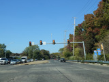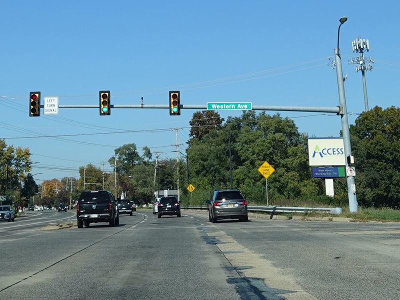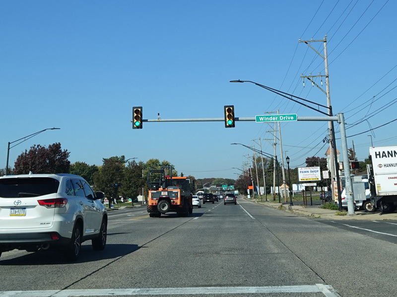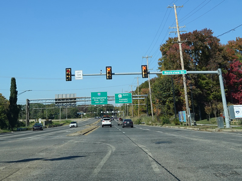 Here, PA 413 is a four-lane divided highway called Veterans Highway. There are traffic lights at Western Avenue, Winder Drive, and Rockview Drive.